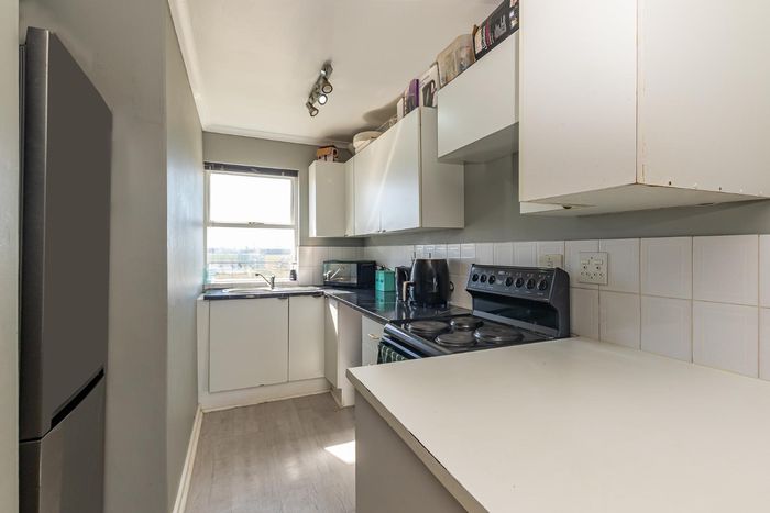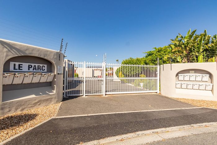 Secure, community-focused living with a communal swimming pool and controlled access in a well-managed complex; first-floor, open-plan two-bedroom, one-bath apartment with a dedicated parking bay.
