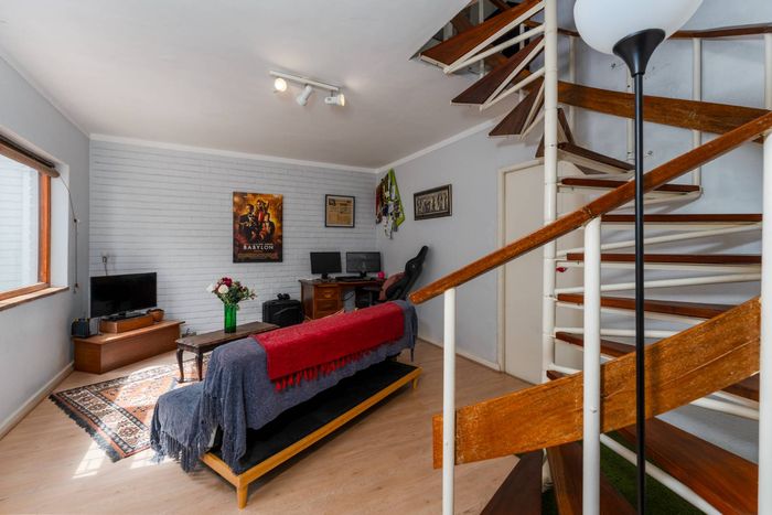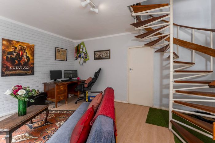 Peaceful cul-de-sac living with a private garden perfect for braais; end-unit double-storey apartment offers a spiral staircase, separate scullery and single garage — one bedroom, one bath.