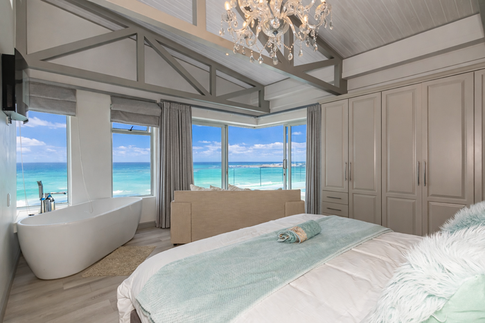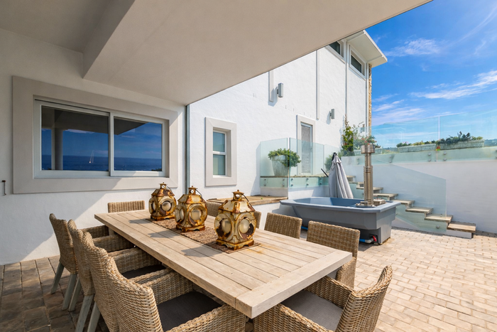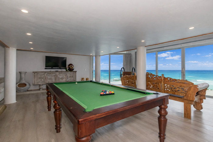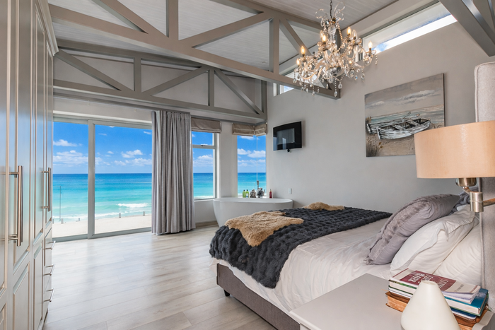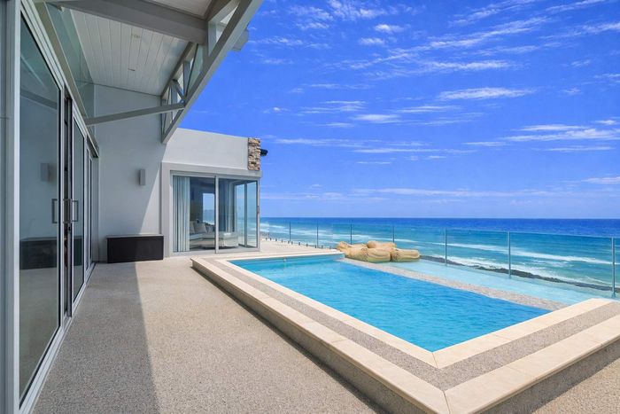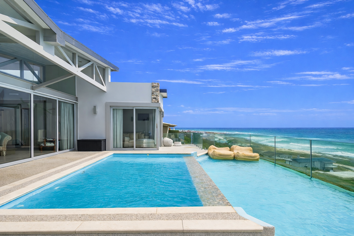 Morning coffee on your terrace as tides lap the lawn — frontline beachfront residence with direct private beach access, expansive terraces, gourmet kitchen and six bedrooms, six bathrooms, double garage.