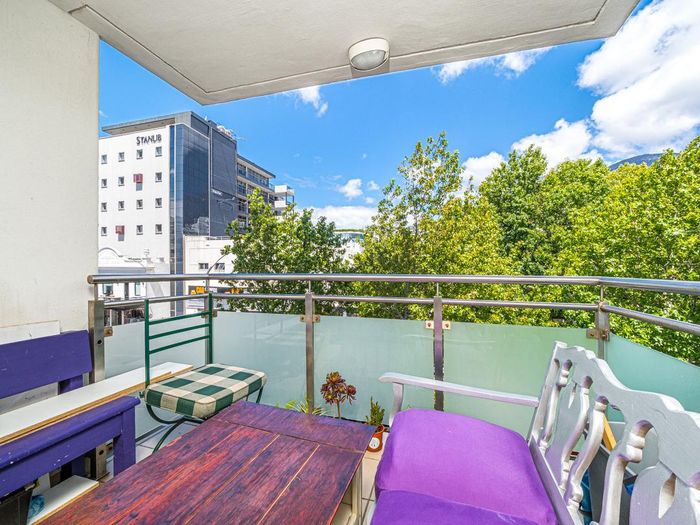 Relax in sun-filled Kenilworth Upper living with a north-facing balcony and Table Mountain views, open-plan kitchen with built-in oven, sliding shutters, one bedroom, one bathroom, two secure parking bays.