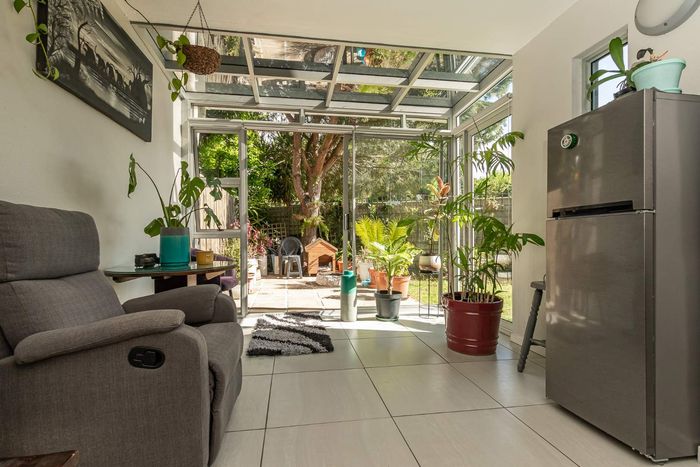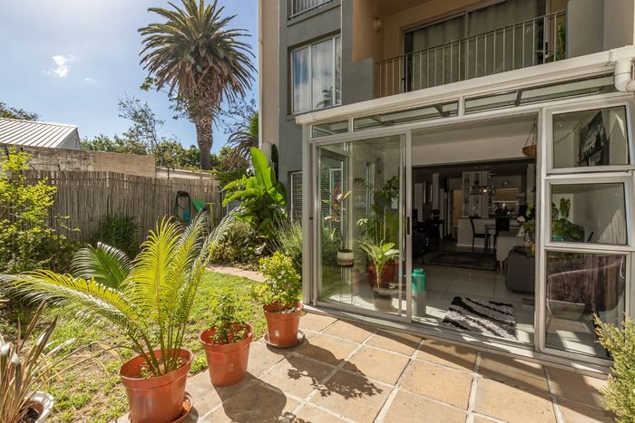 Tranquil Plumstead ground-floor retreat with sunlit open-plan living flowing to a private garden, modern kitchen and secure automated gates, two bedrooms, one bathroom, undercover parking.