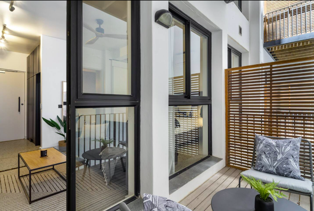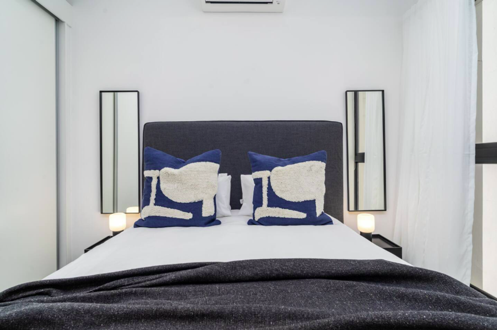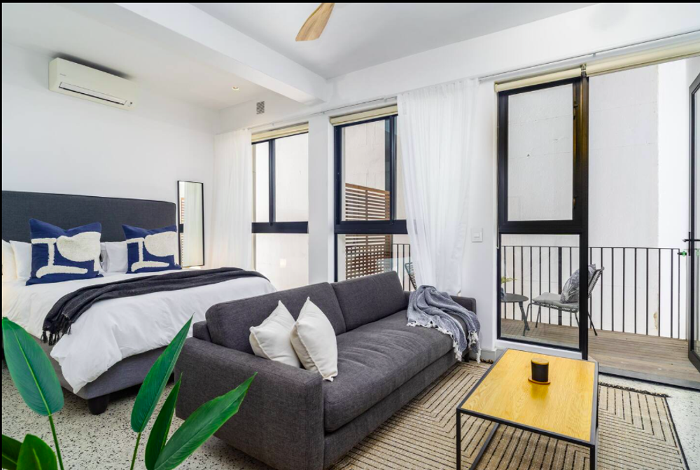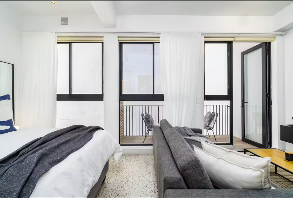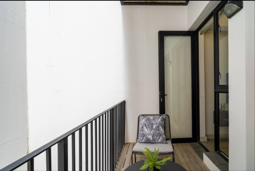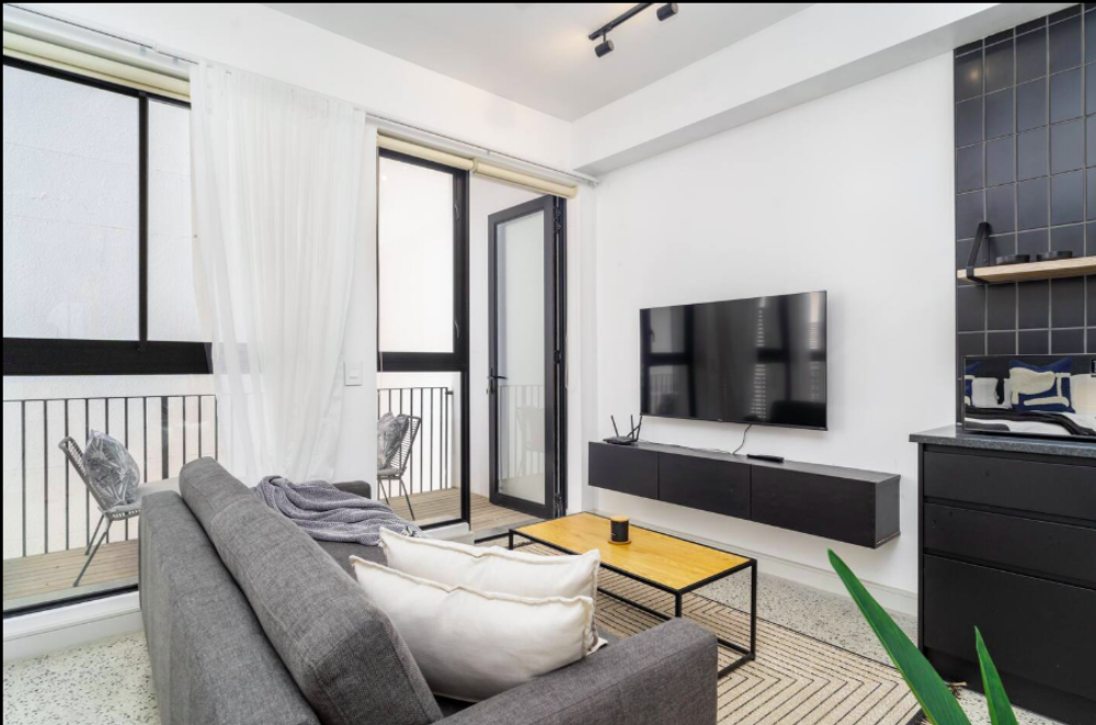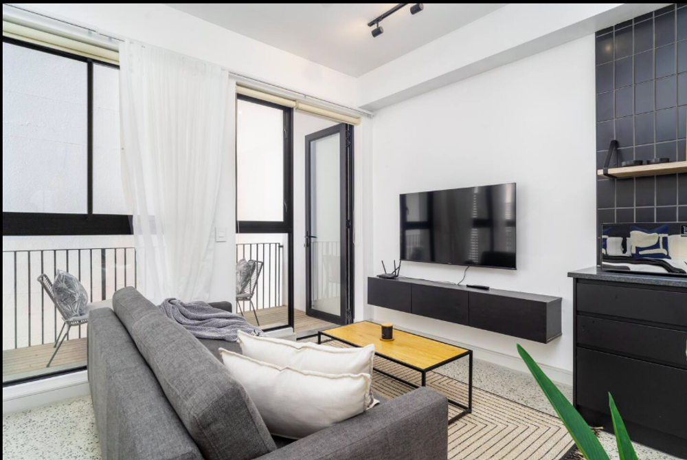 The apartment features an open-plan layout with high-end finishes throughout. Floor-to-ceiling windows allow for an abundance of natural light, while a private balcony offers an outdoor escape in the middle of the city. The fully equipped kitchen boasts premium appliances, including a sleek Smeg stove, complemented by top-quality furnishings and contemporary design.