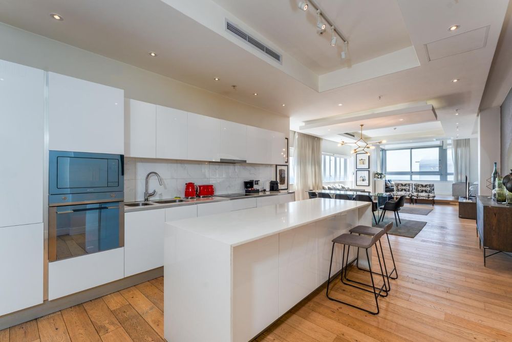 The open-plan kitchen, equipped with high-end appliances, flows effortlessly into the spacious dining and lounge areas. Floor-to-ceiling glass panels allow for an abundance of natural light and showcase breathtaking views of the harbor and the sparkling city skyline. The master suite serves as the ideal retreat, while two additional bedrooms offer ample space and refined comfort for family or guests.