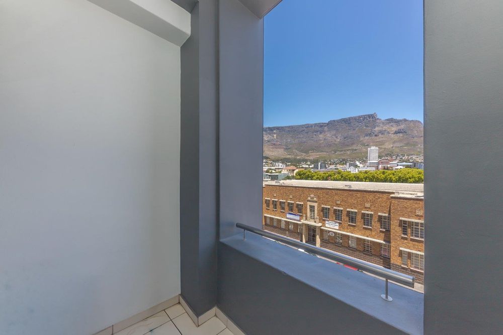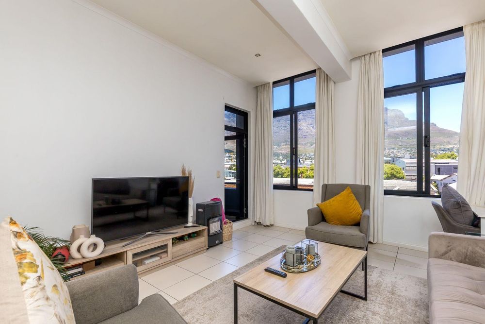 The layout includes an open-plan living and dining area, along with a kitchen that has double doors leading to a sunny balcony offering stunning views of Table Mountain.