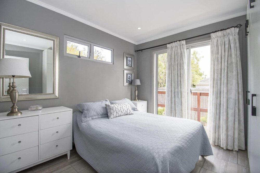 The main bedroom with built in cupboards and tiled floors is light and sunny.