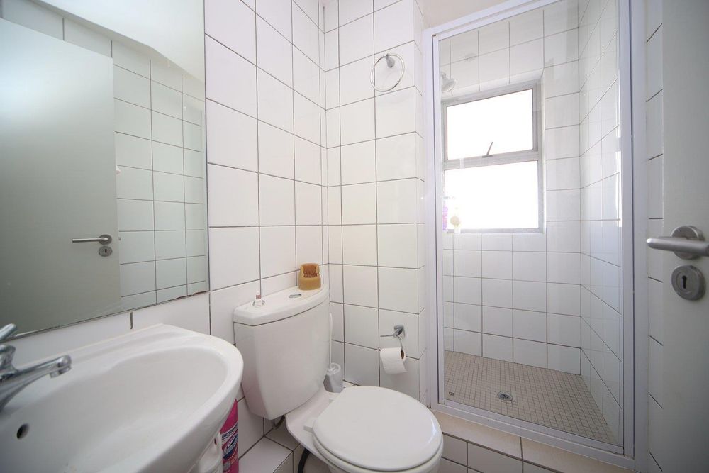 The bathroom has a toilet, basin and a spacious shower.