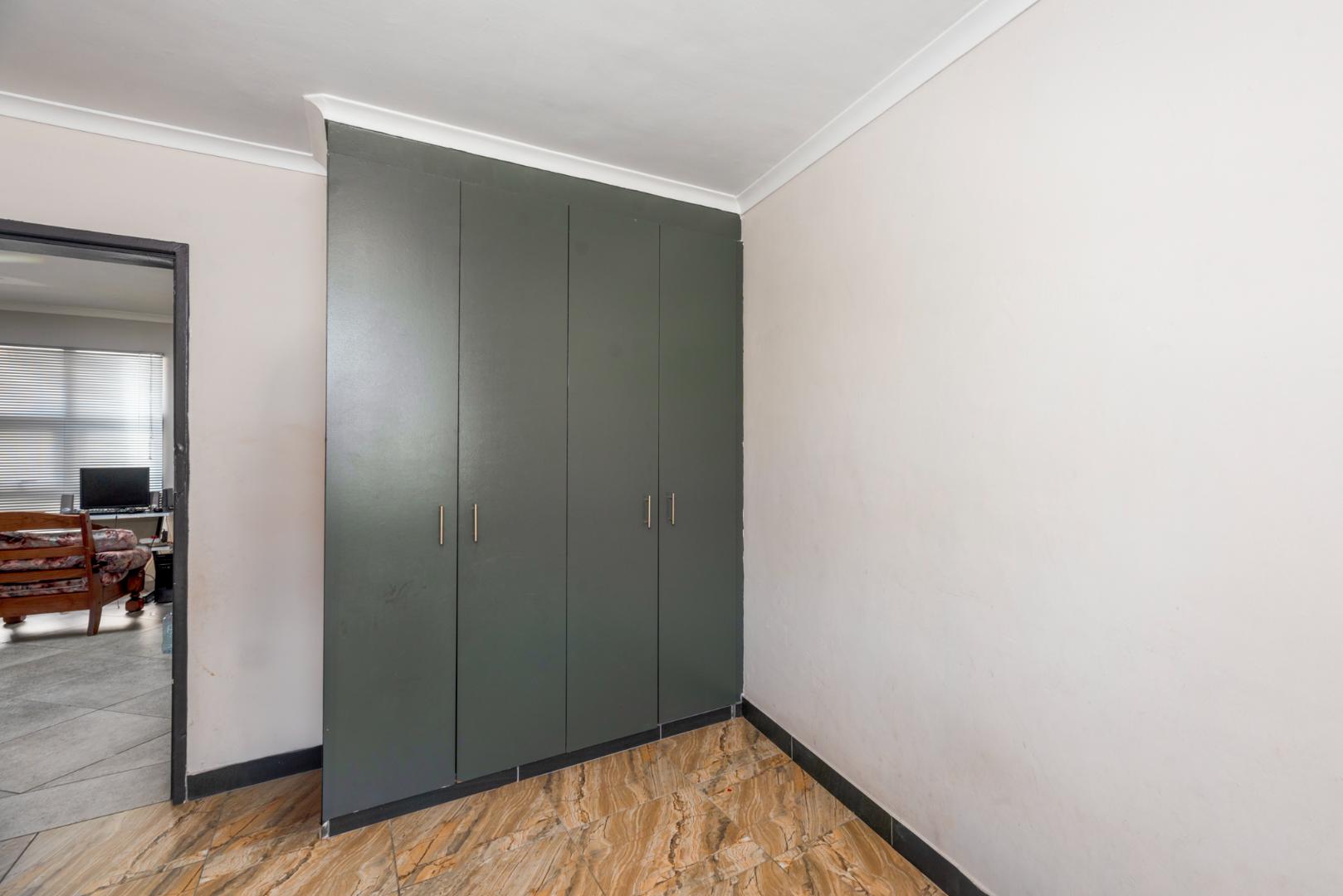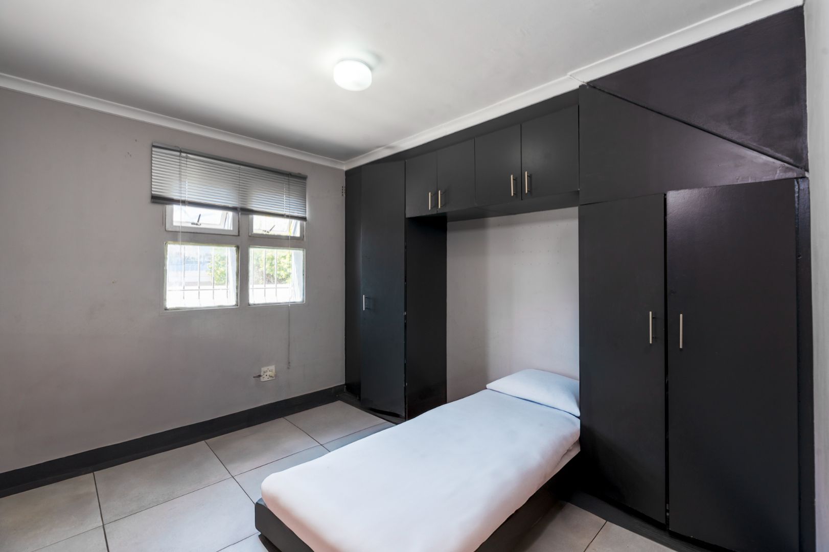 The large main bedroom features built-in cupboards that are conveniently designed to accommodate your bed between the cupboards.