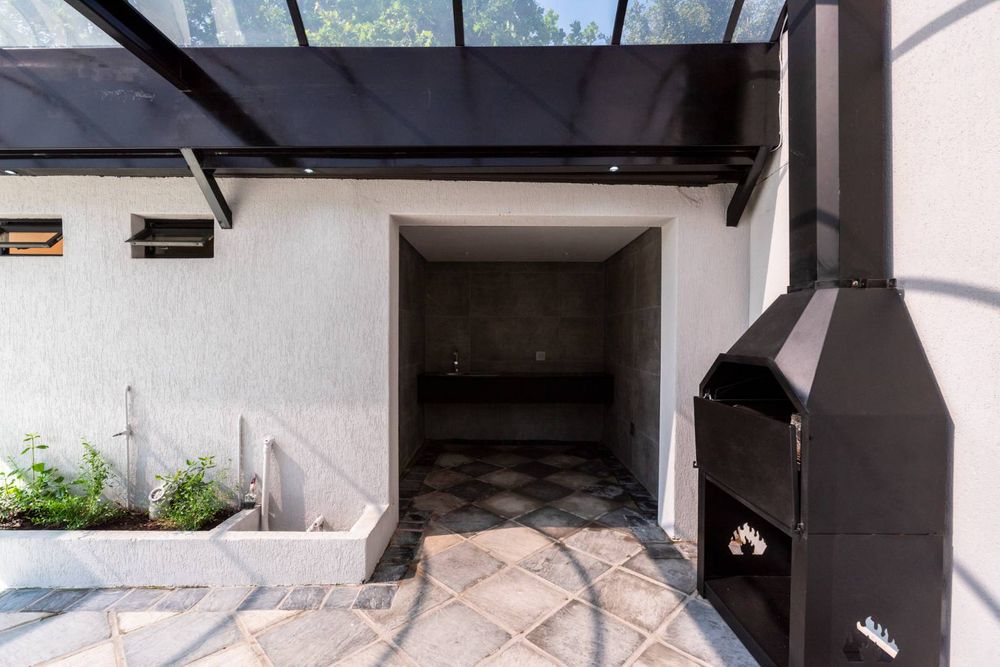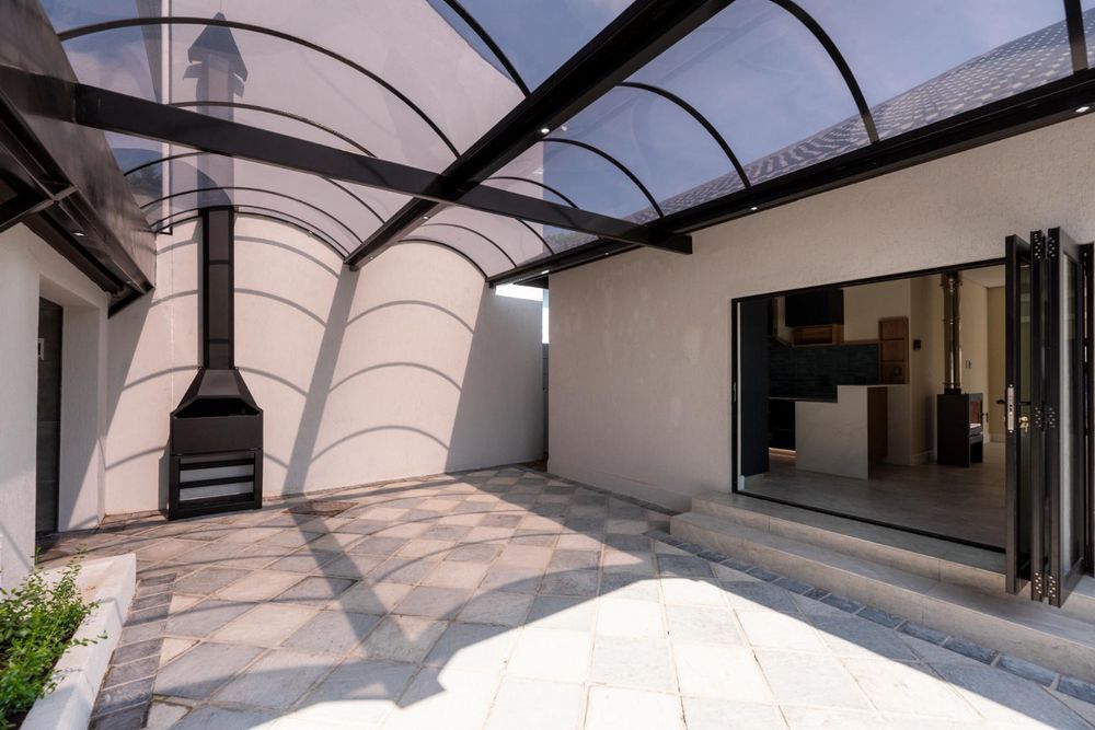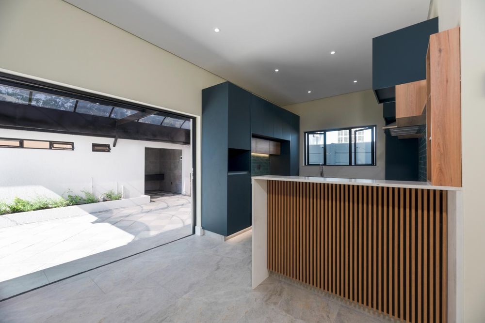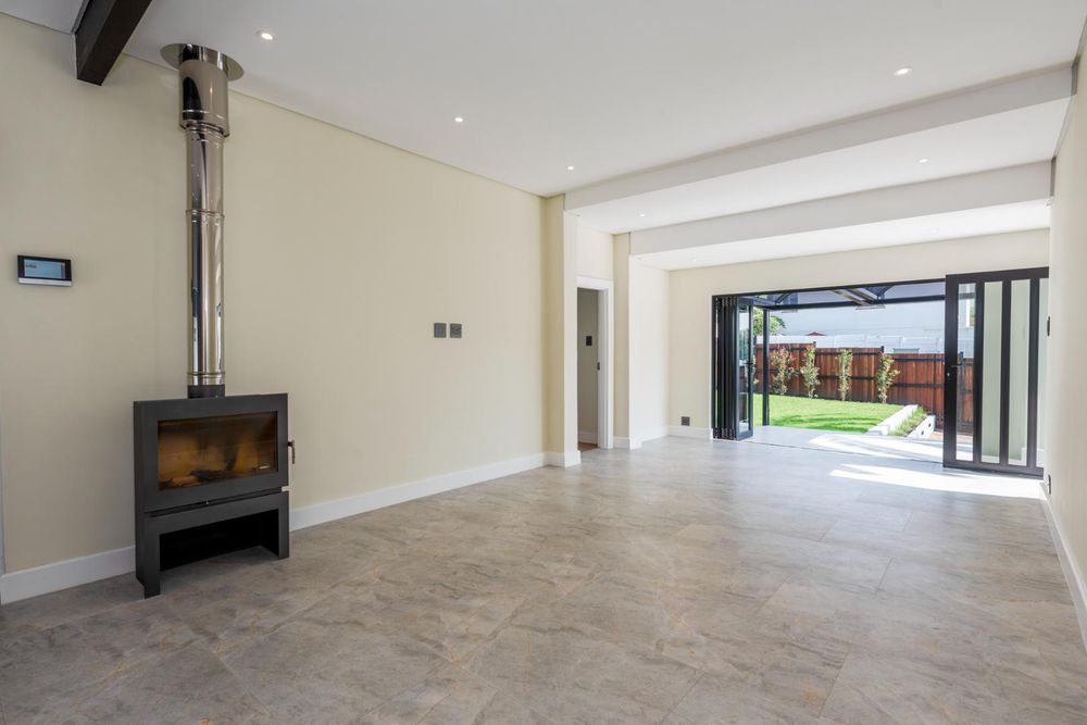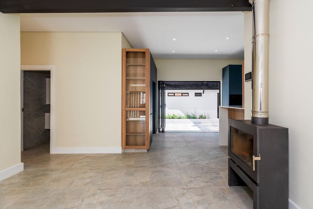 The inviting living area is bathed in natural light and centers around a charming wood-burning fireplace, creating a cozy atmosphere. This space opens directly onto the front garden, effortlessly extending the living area outdoors for seamless indoor-outdoor living. The kitchen is a culinary delight, featuring a sleek and contemporary design, premium finishes, a SMEG oven with a gas hob, and ample storage space. It also accommodates a double fridge and dishwasher, making it both functional and stylish. The adjoining entertainment patio, accessible through sliding doors, is perfect for year-round entertaining and relaxation. Additionally, the kitchen opens to a back patio and a separate staff room with its own bathroom, enhancing the property’s versatility.