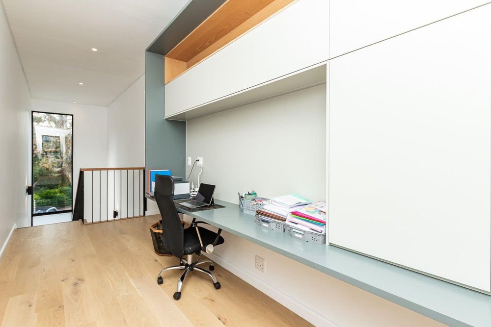 The landing has been thoughtfully transformed into a versatile open office area, complete with a study desk and shelves, offering ample room for two people.
