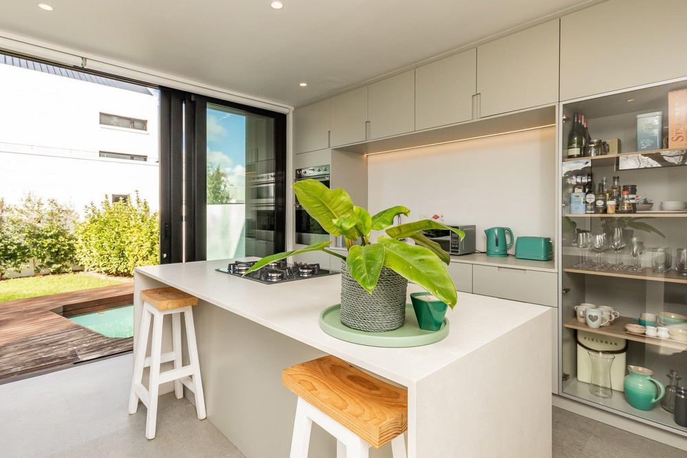 The modern open-plan fully equipped kitchen is cleverly designed with Caesar stone countertops and a spacious island that comfortably seats 4 people.