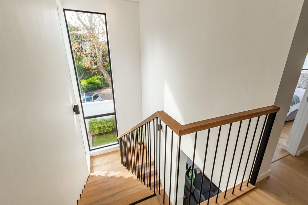 The signature wooden and steel staircase leading to the second floor features a modern design, providing access to two bedrooms with built-in cupboards.