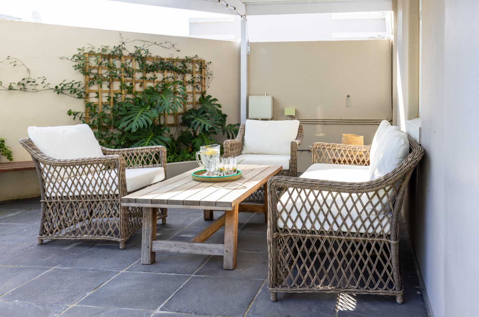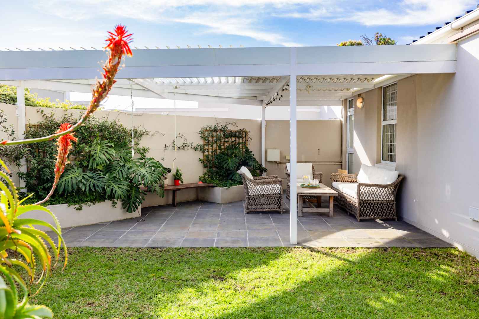 One of the standout features of this property is its private garden oasis. Enjoy a lush lawn surrounded by established greenery, including lemon and granadilla (passion fruit) trees, as well as creeping vines that enhance the tranquil setting. The covered louvered patio creates a versatile entertainment area, perfect for year-round indoor-outdoor living.