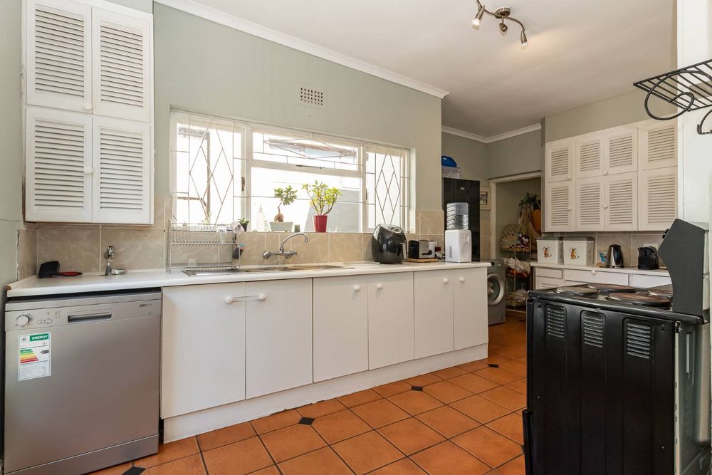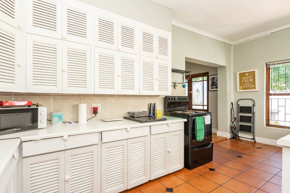 The spacious, sunlit kitchen is a delight for any home cook, boasting abundant cupboard space to keep everything neatly organized.