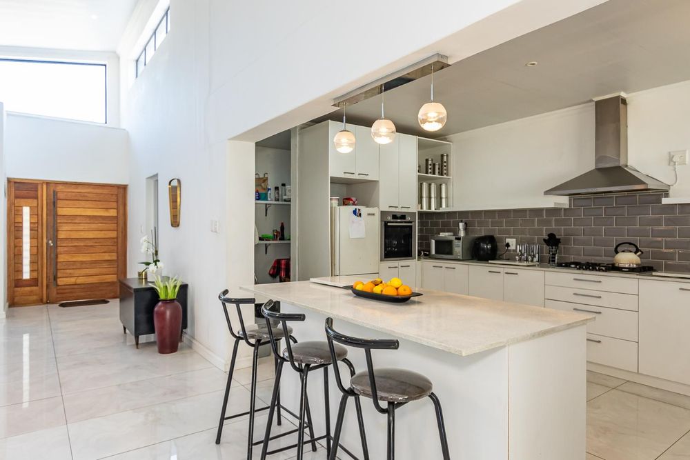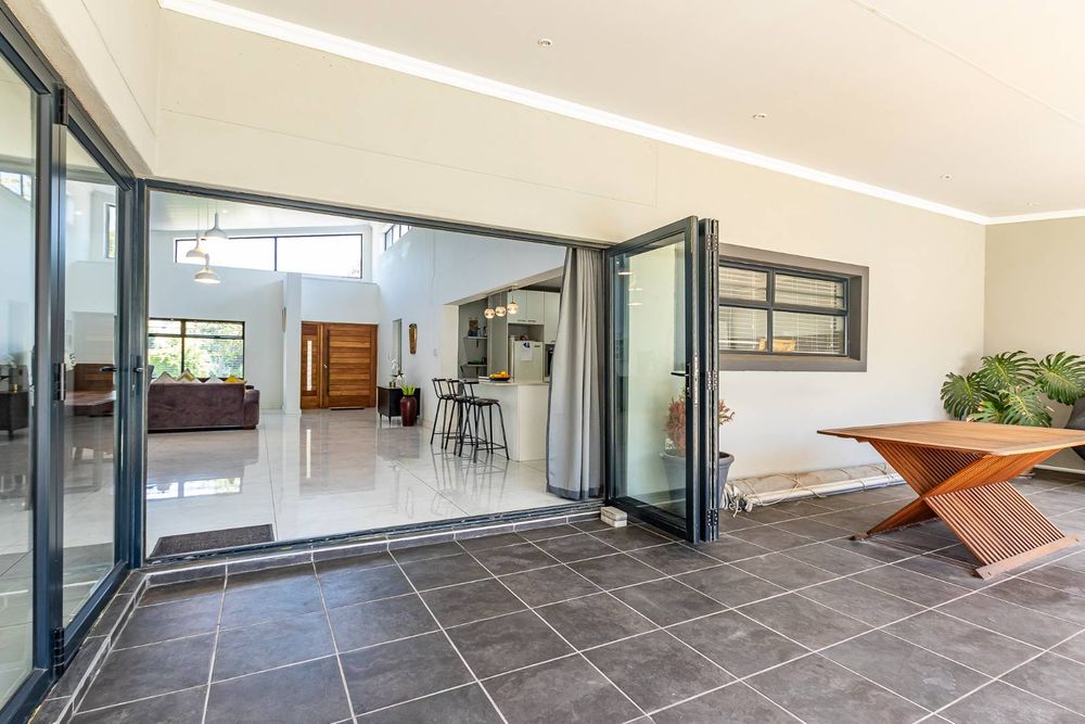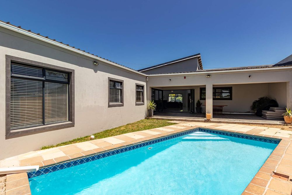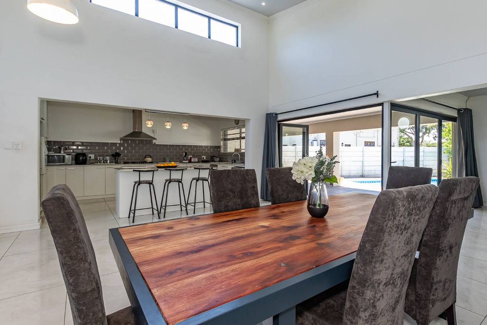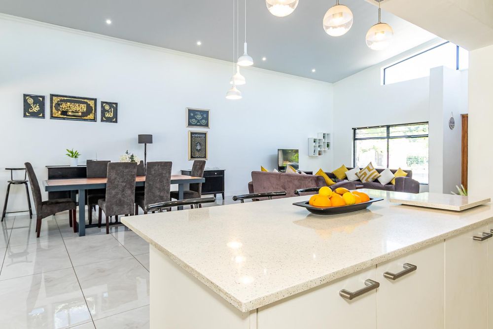 A designer kitchen flows effortlessly into the dining and lounge areas, extending onto a covered entertainment patio overlooking a sparkling swimming pool — ideal for relaxed family gatherings or vibrant get-togethers.