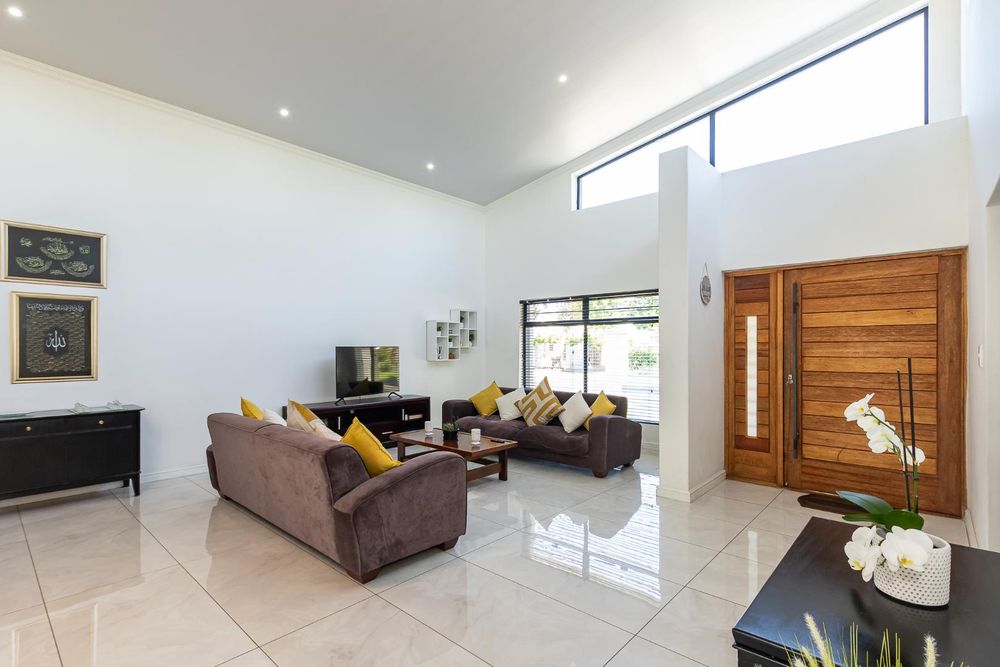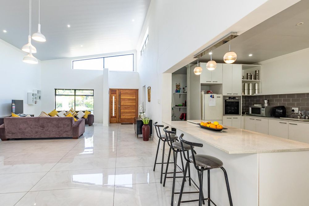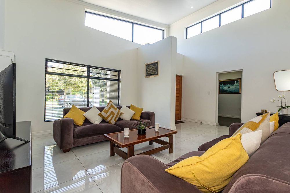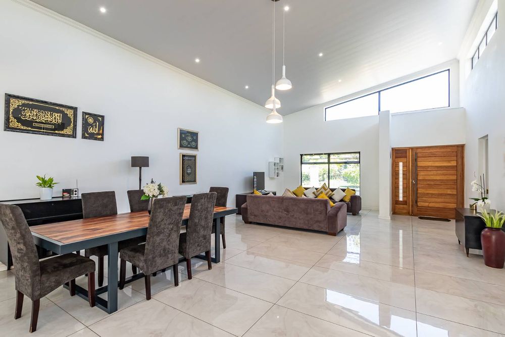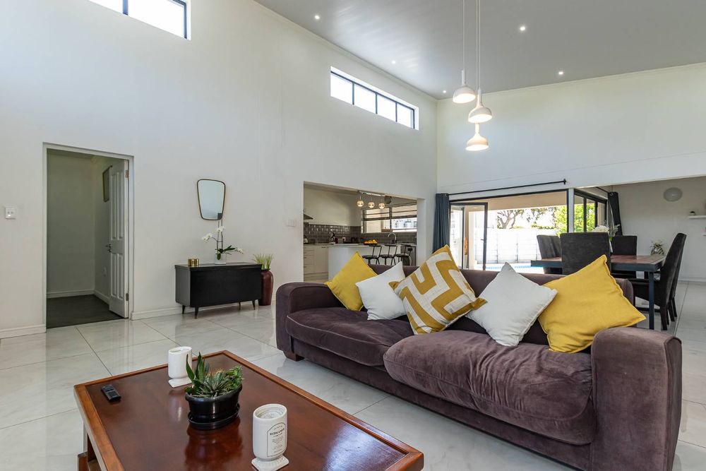 Step into a light-filled open-plan living area boasting double-volume ceilings that create an impressive sense of space and elegance.