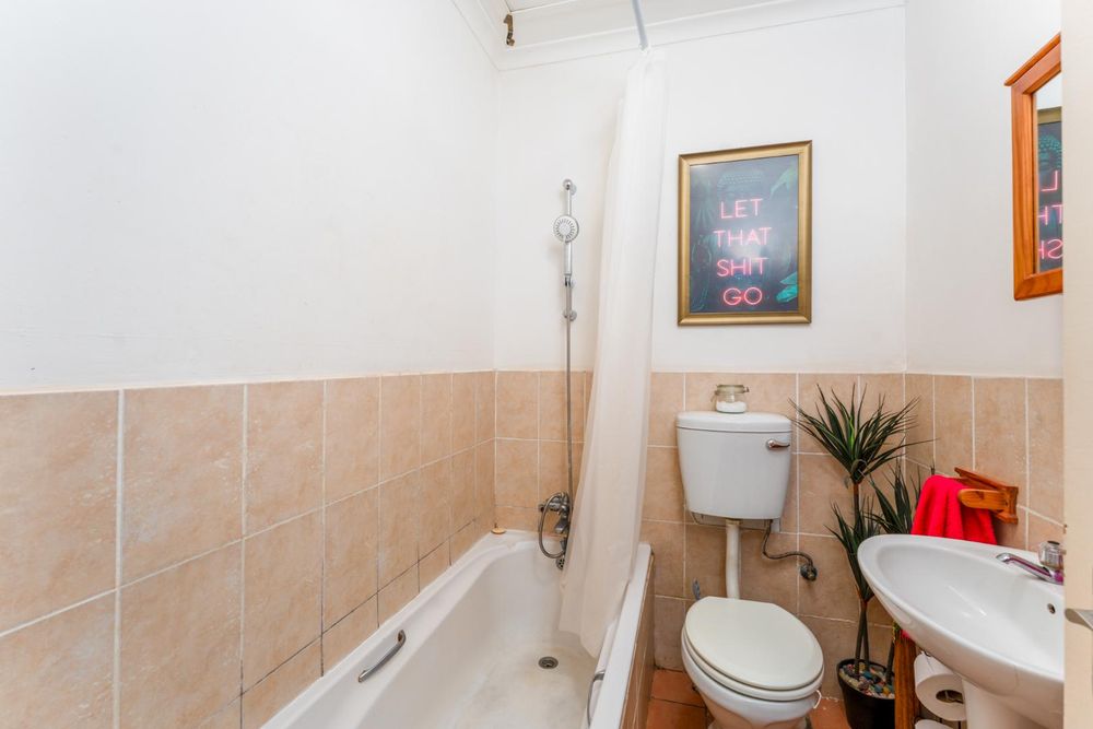 The bathroom consists of a bath, basin & toilet with shower over the bath.
