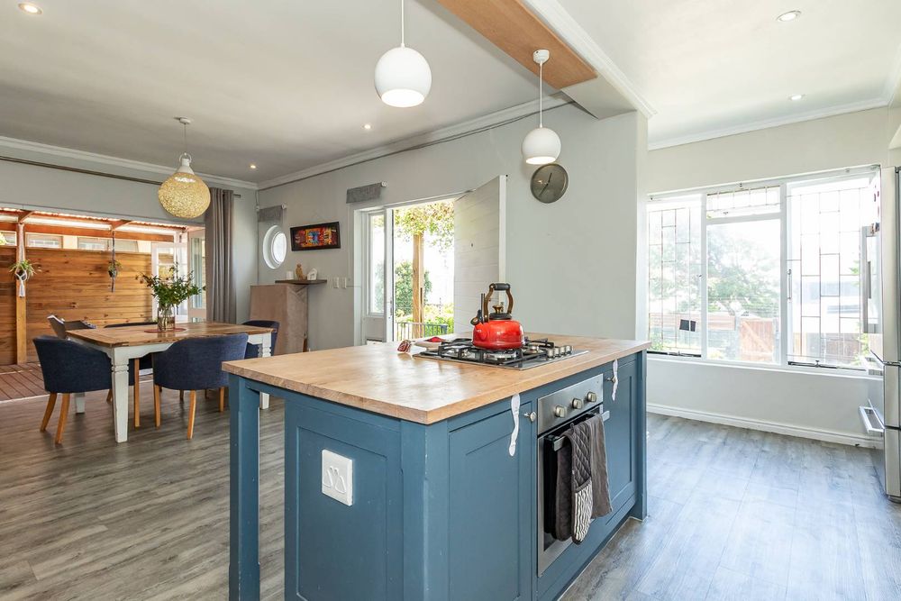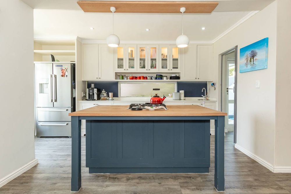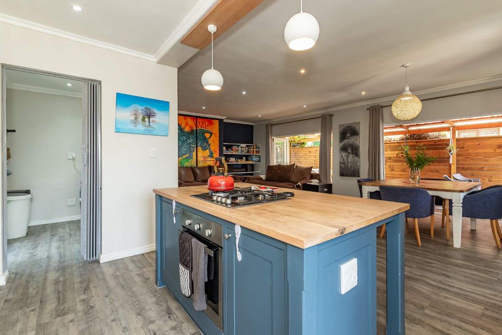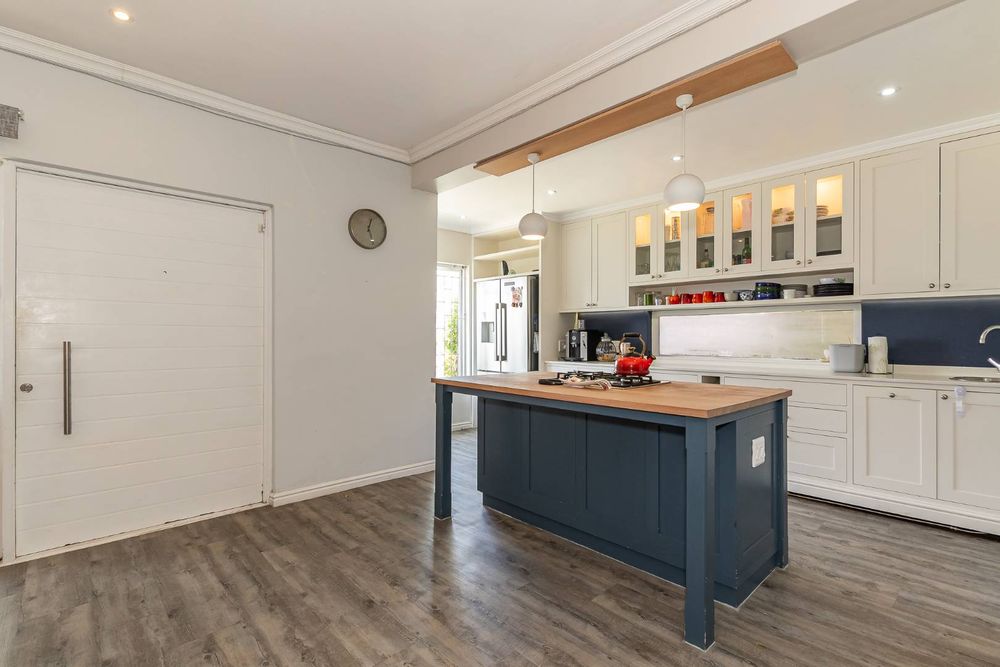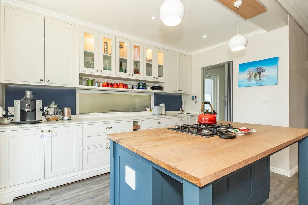 The kitchen is beautifully designed and features a central island, gas hob, and electric oven. It also has a separate scullery with plumbing for the washing machine and dishwasher.