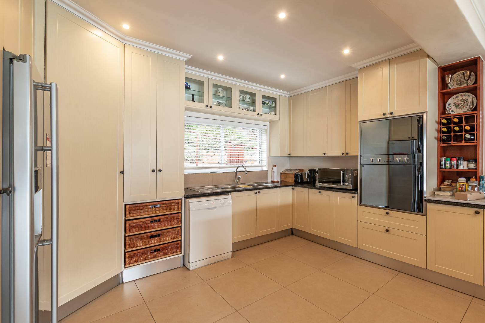 The lower level reveals an expansive open-plan living area with a beautifully integrated kitchen, opening onto a deck and landscaped garden. Two exceptionally spacious en-suite bedrooms are positioned on either side, each enjoying serene views and an abundance of natural light. A separate laundry adds to the home’s practical elegance.