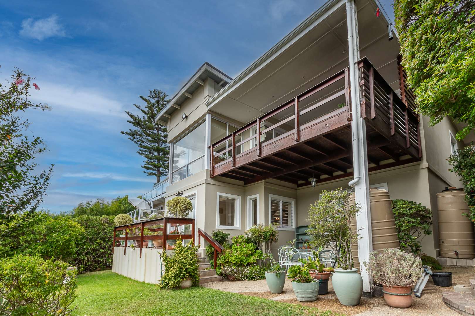 Surrounded by a meticulously maintained garden, the property includes five JoJo water tanks and a garden shed, ensuring both sustainability and convenience. A private pedestrian gate leads directly to a pathway down to the beach, offering seamless access to the coastline.