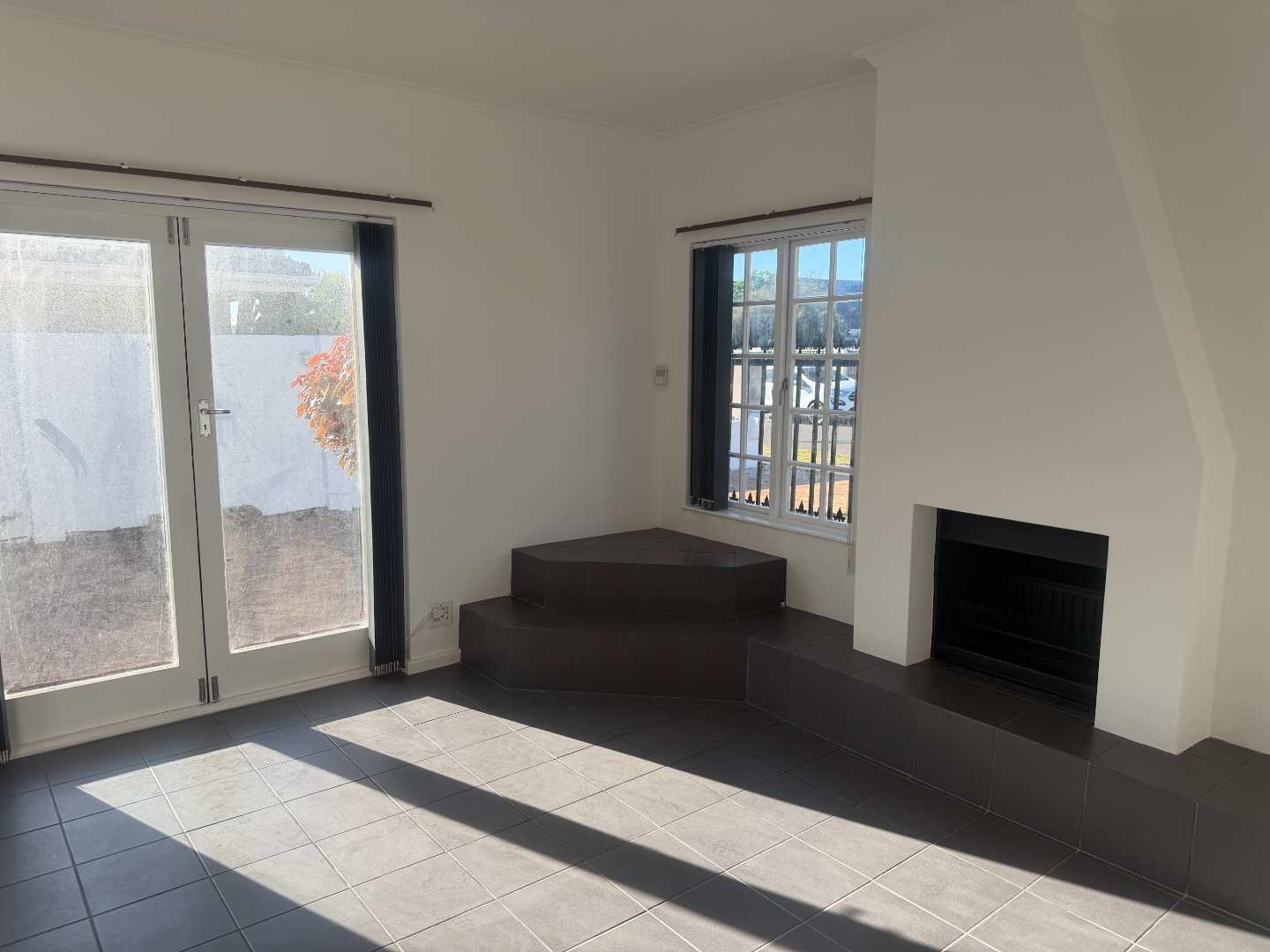 Open plan lounge and dining room with French doors to the garden. In the lounge area, there is a fireplace.