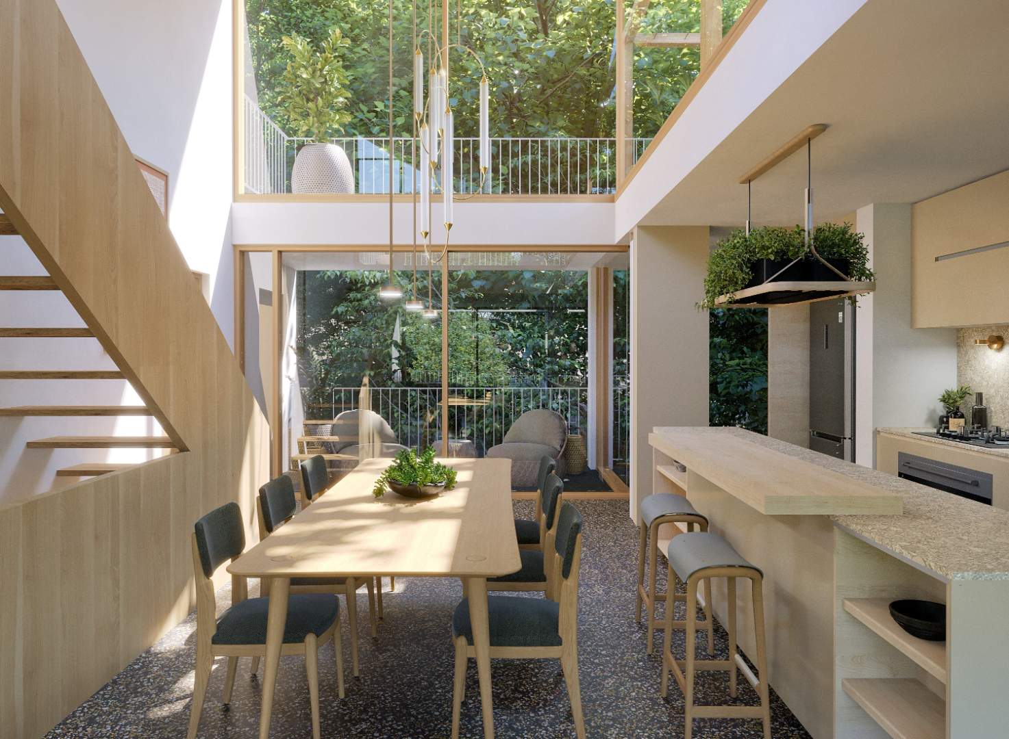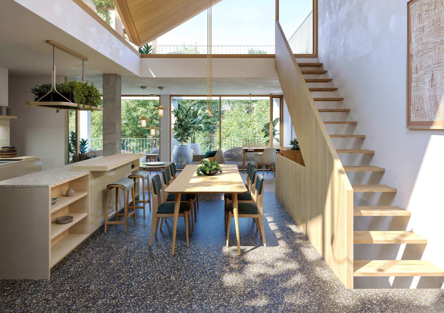 This residence showcases premium architectural finishes, including stone and timber flooring, textured brickwork, and raw concrete ceilings. These elements come together to create a contemporary aesthetic that harmoniously blends with the surrounding forest landscape.