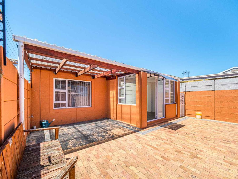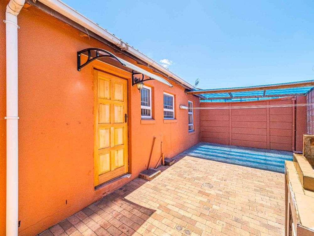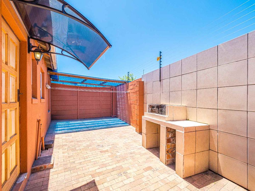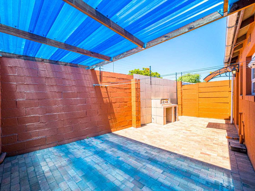 Spacious Back area has covered patio plus a Built in Braai for entertaining. Very sunny front with covered patio - ONE OF THE BIGGEST PLOTS IN THE AREA.