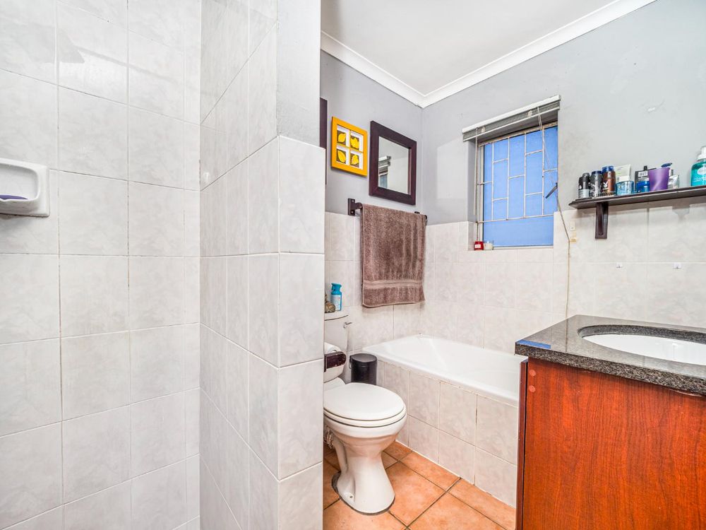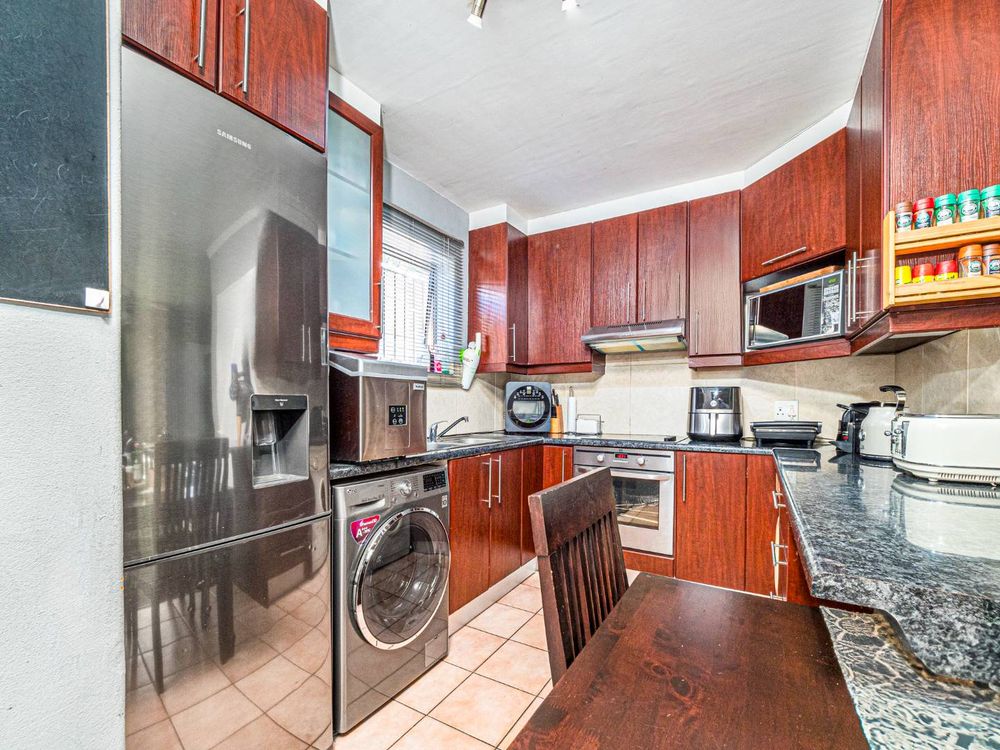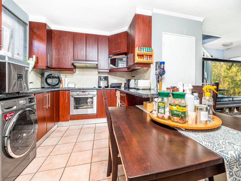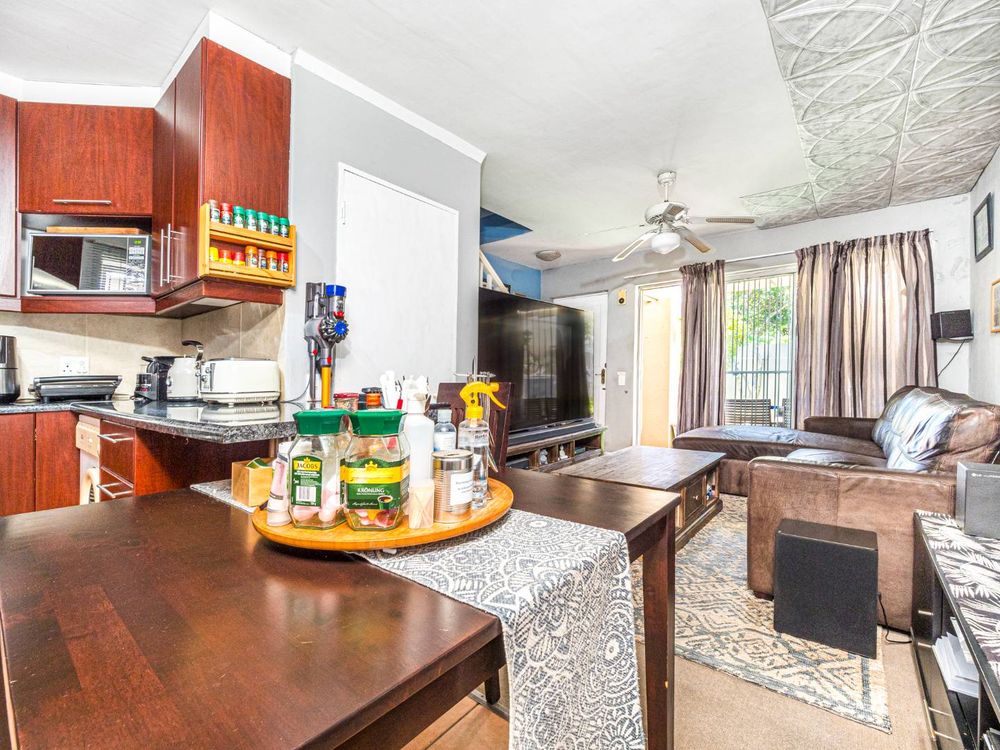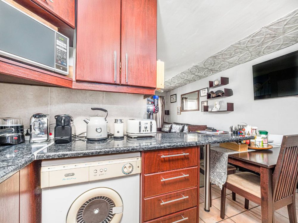 Spacious lounge with a ceiling fan and sliding door to the sunny front garden. Open plan dining area. Stylish open plan kitchen with AEG built-in hob, electric oven, extractor fan, breakfast nook and space for 2 appliances.