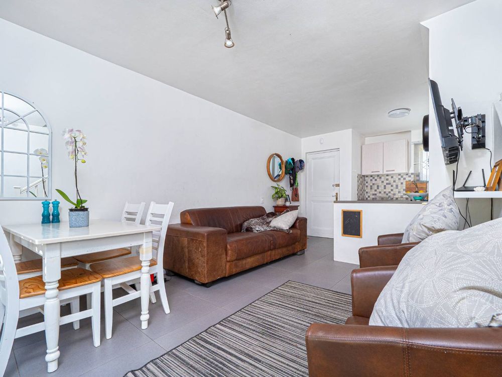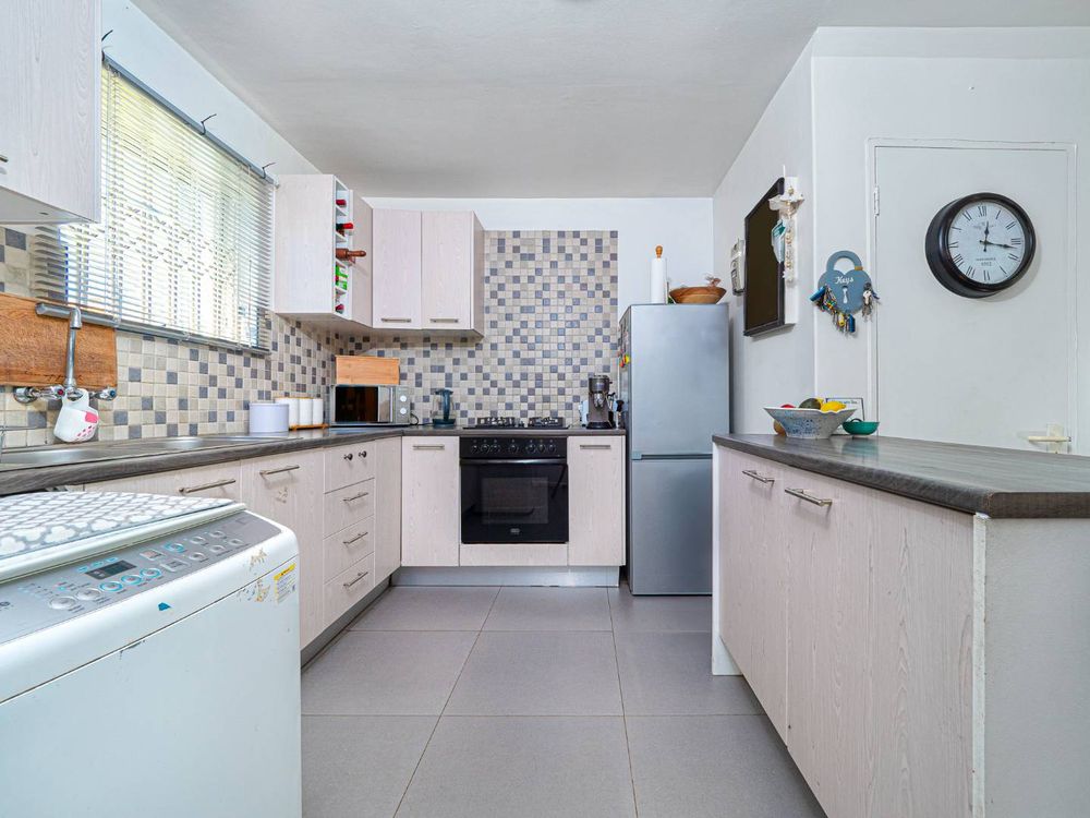 Spacious lounge with sliding door to the sunny garden. Open plan dining area. Stylish open plan kitchen with Bosch built-in gas hob, electric oven and space for 1 appliance.
