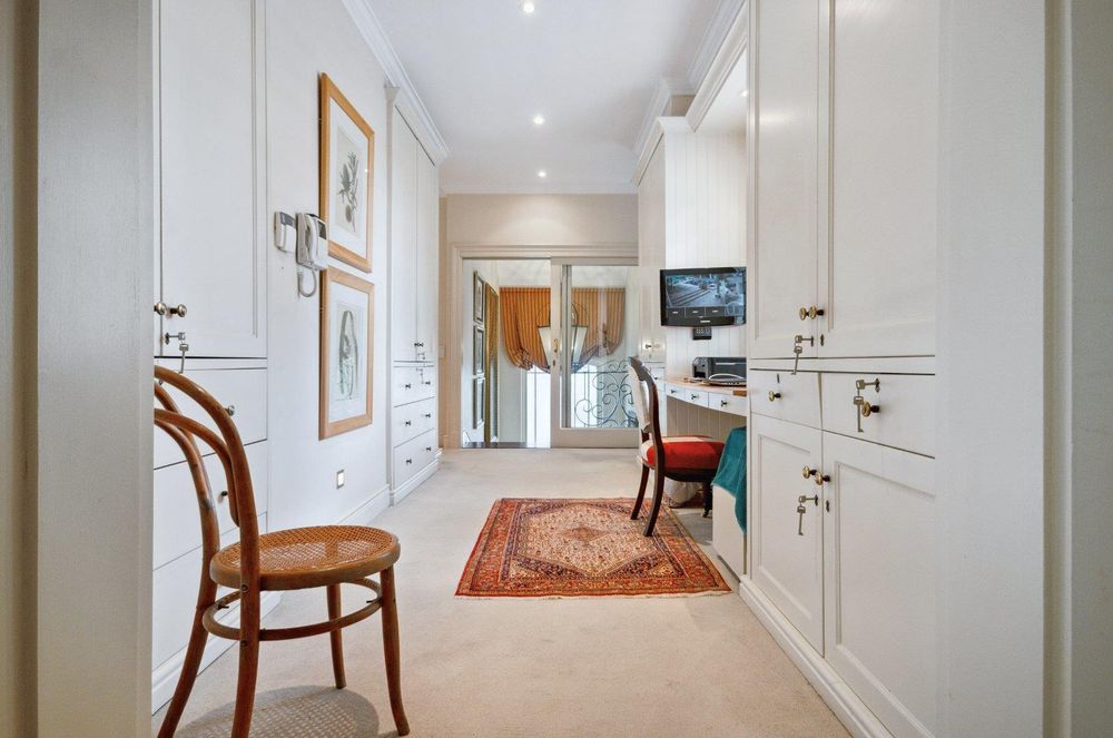 The executive study is carpeted and with built-in cupboards and American shutters.