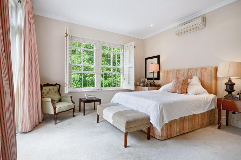 The Main Bedroom, carpeted and spacious, features air conditioning, underfloor heating, heated towel rails, and a walk-in dressing room.