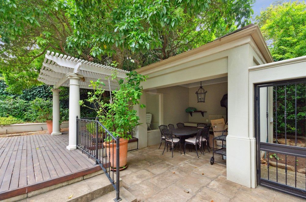 Outside, you will find a delightful large, covered patio that overlooks the pool and garden. The swimming pool features a separate fountain. There is also a covered Braai area next to the pool, perfect for entertaining. Additionally, there is a separate flatlet that can be used for domestic accommodation, a home office, or a student pad. The automated double garage includes a wheelchair ramp and extra space for a trailer, bicycles, and other outdoor equipment. Secure parking for 3-4 cars is available behind a security gate. The low-maintenance garden beds are watered by a sprinkler system, eliminating the need for lawn mowing. A storeroom adds convenience to the property.