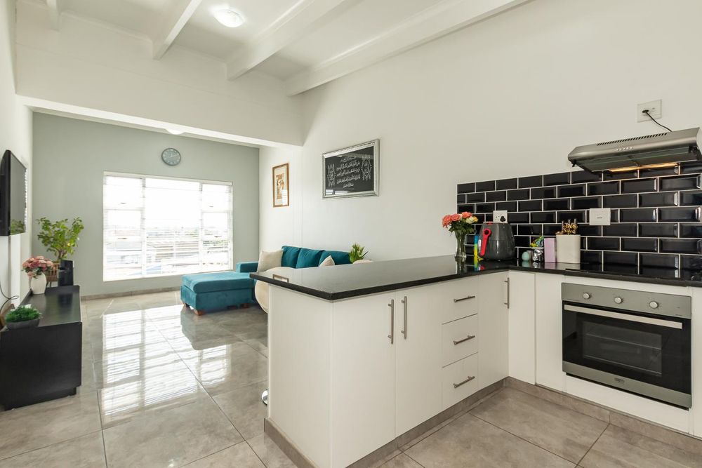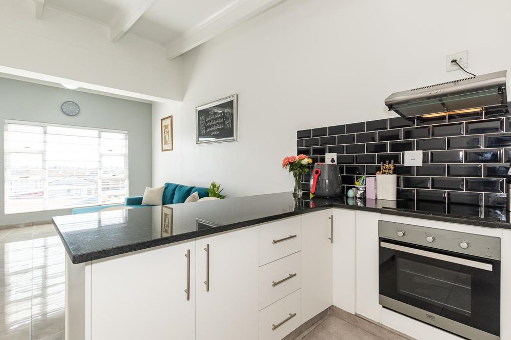 The heart of the flat is the bright open-plan lounging and kitchen area with high ceilings. The kitchen boasts multiple cupboard spaces, perfect for storing cookware, utensils, and groceries. The ceramic hob , oven and extractor fan make cooking a breeze, while there's ample space for any size fridge, plumbing for appliances and a double sink