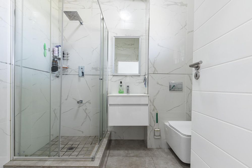 Beautiful marble tiled design bathroom which accommodates a spacious shower , hand basin and toilet.