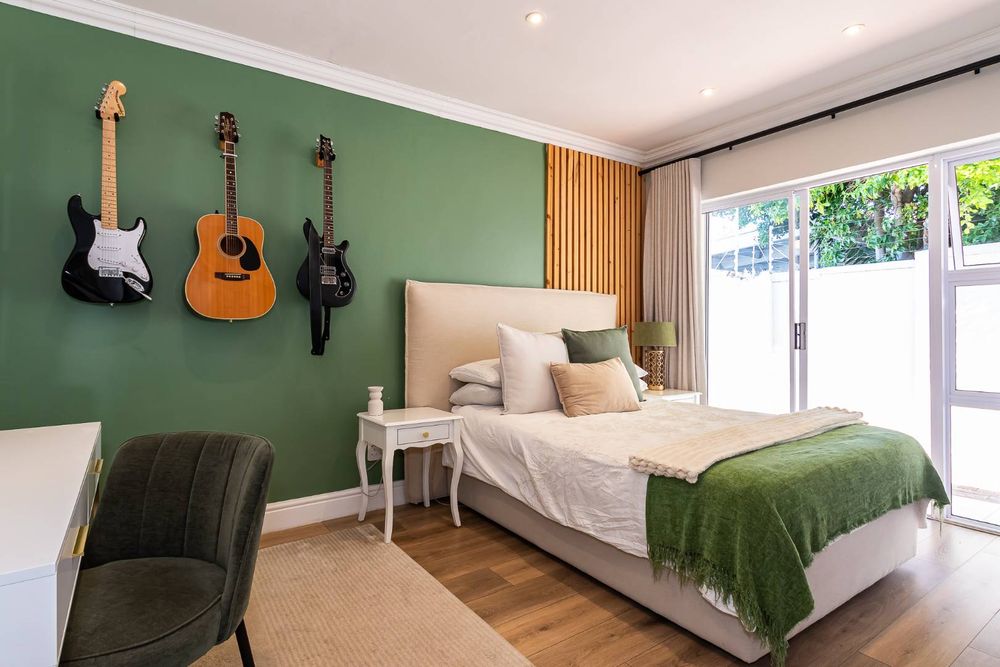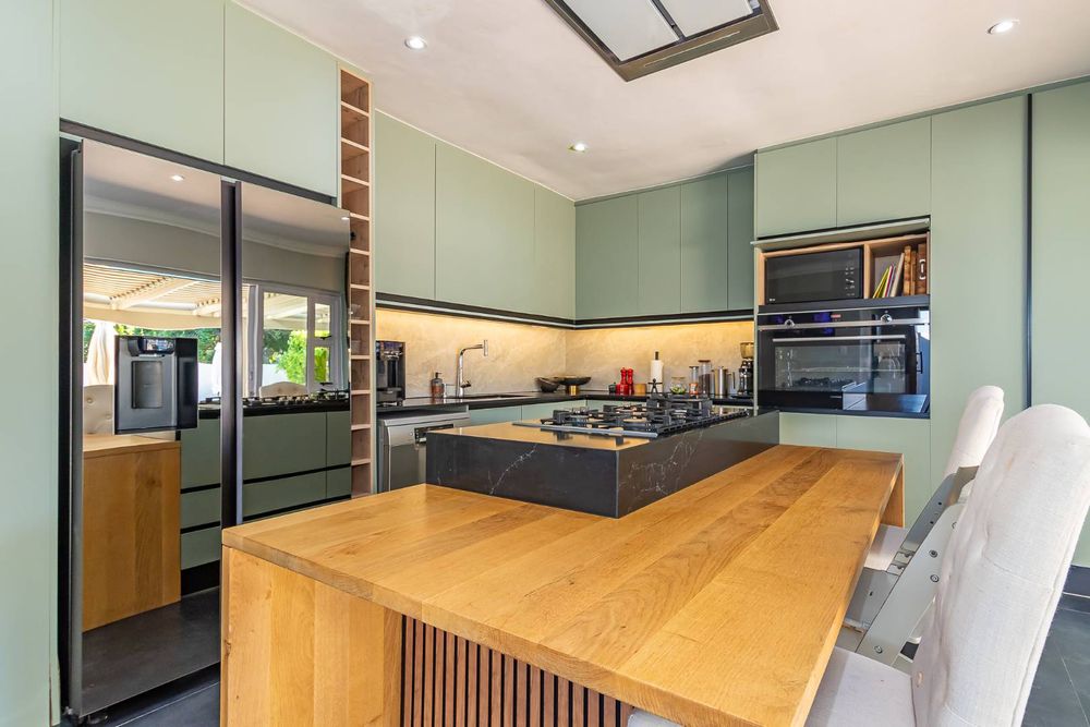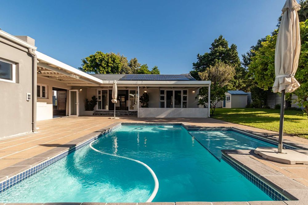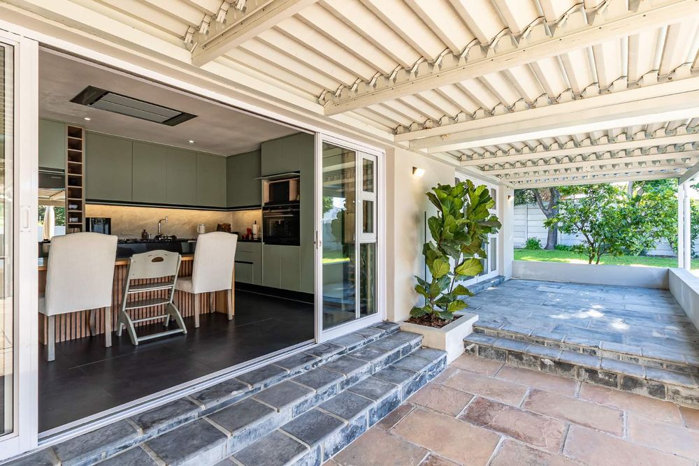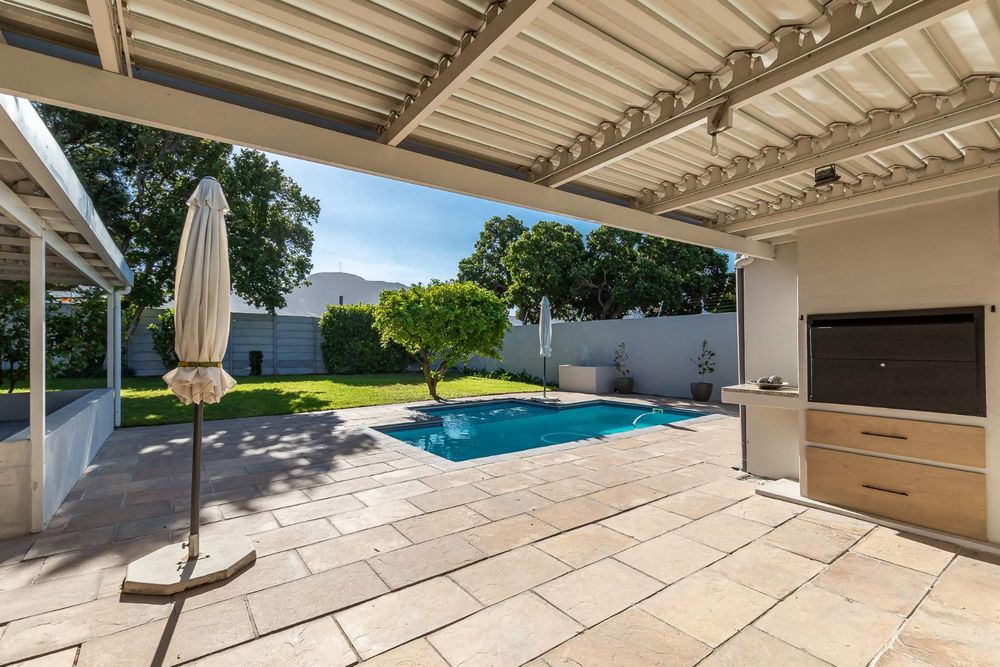 Large sliding doors extend the living space onto a covered patio that wraps around toward the main suite—creating a natural setting for entertaining. From here, the garden, pool, and braai area unfold with ease, framed by uninterrupted views toward the Constantia mountains and their evening sunsets.