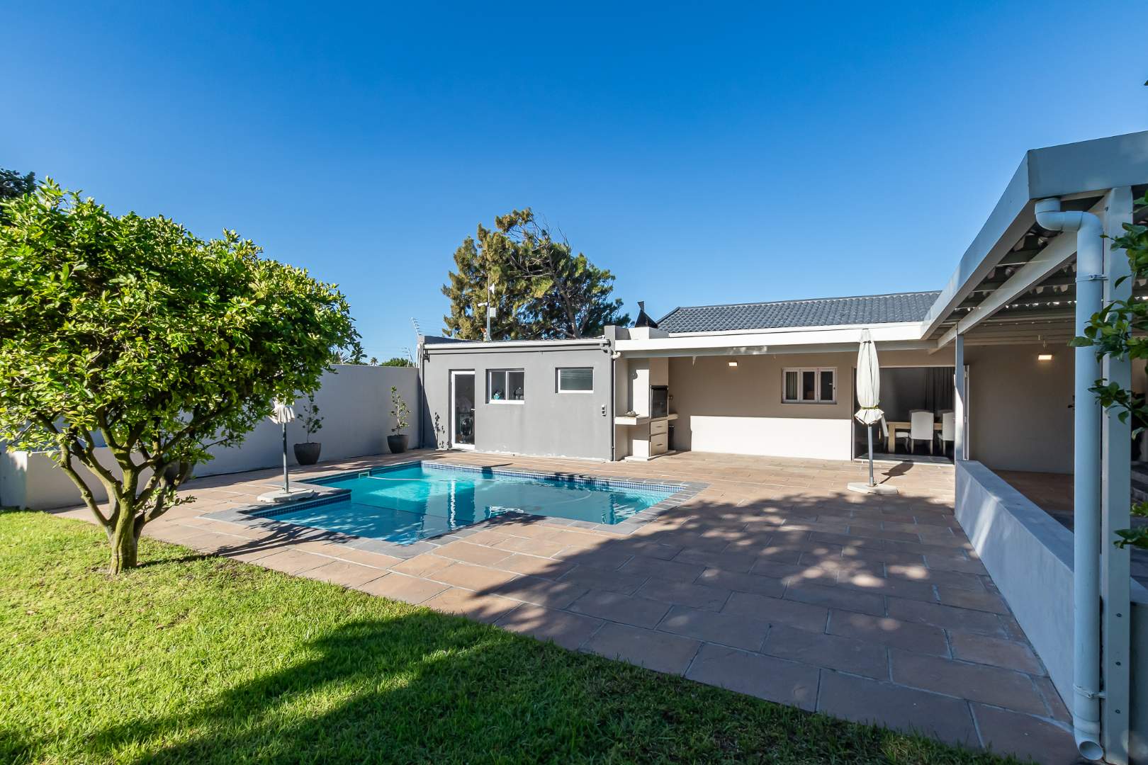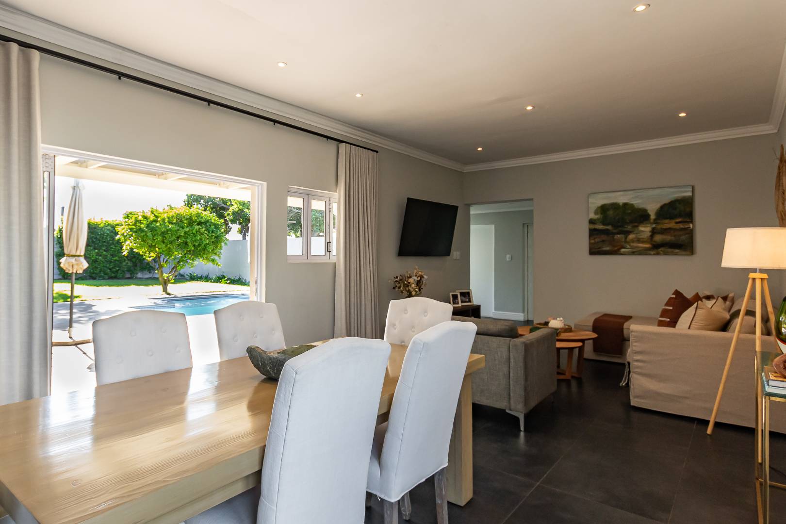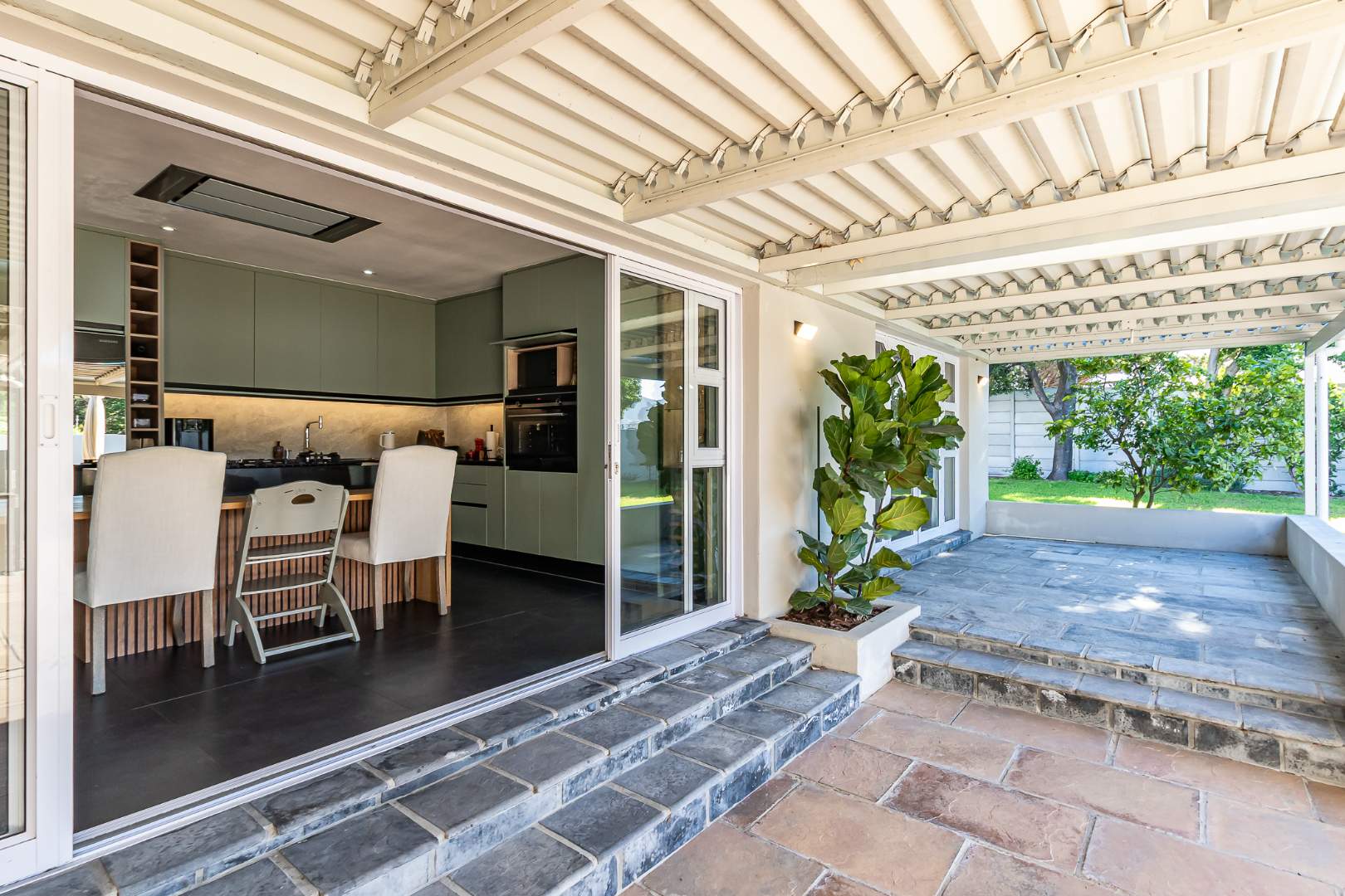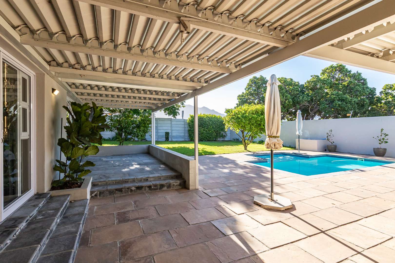 Sliding doors from the lounge and dining area open onto a generous covered patio that wraps around to the main bedroom, creating the perfect space for entertaining and relaxed outdoor living. The patio overlooks a beautiful garden with a sparkling pool and built-in braai area, ideal for hosting family and friends. From here, you can also enjoy magnificent sunsets disappearing behind the Constantia Berg mountains while sharing a glass of wine.