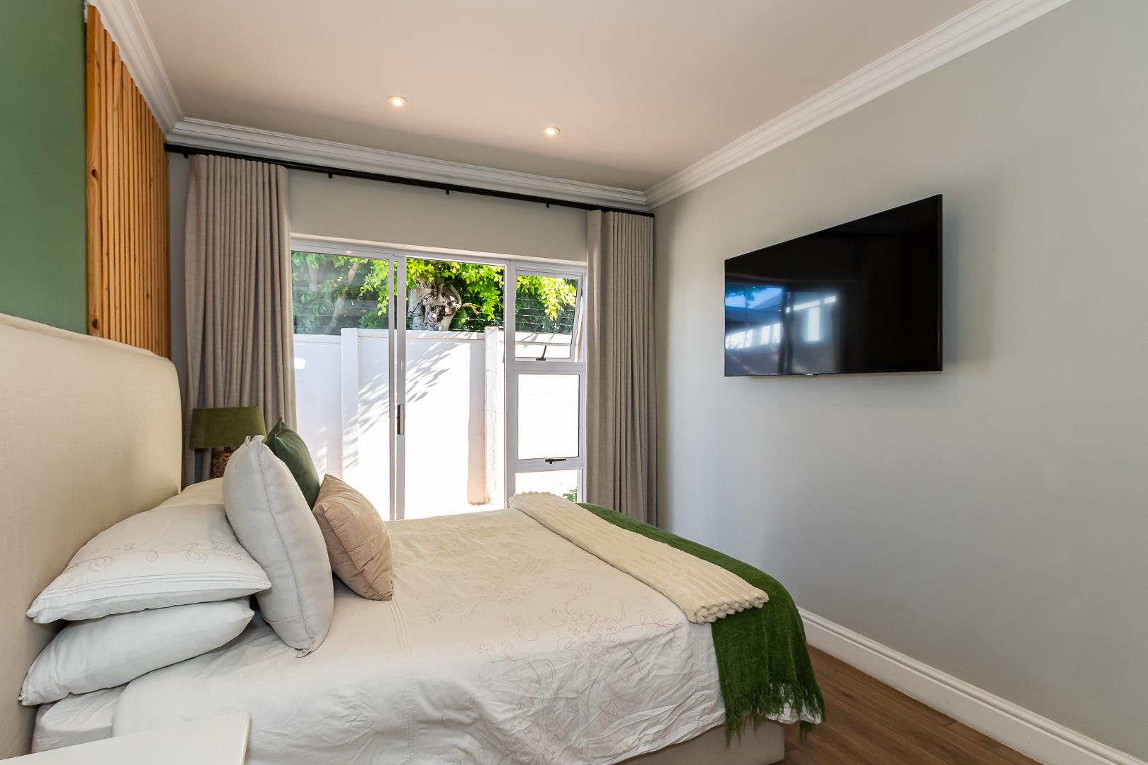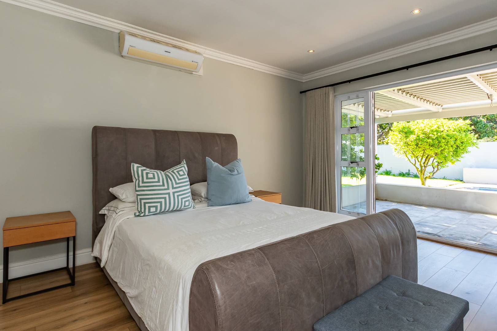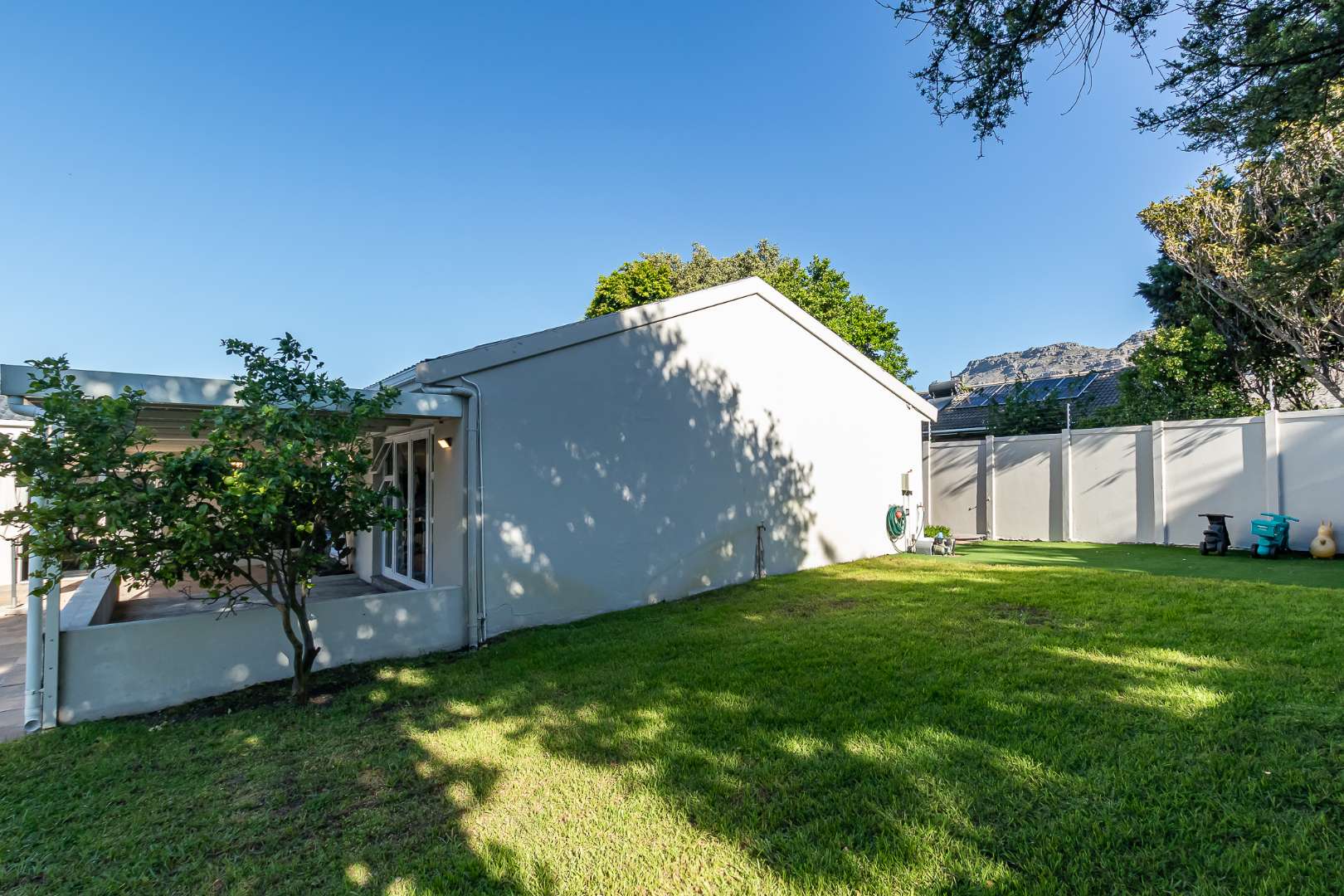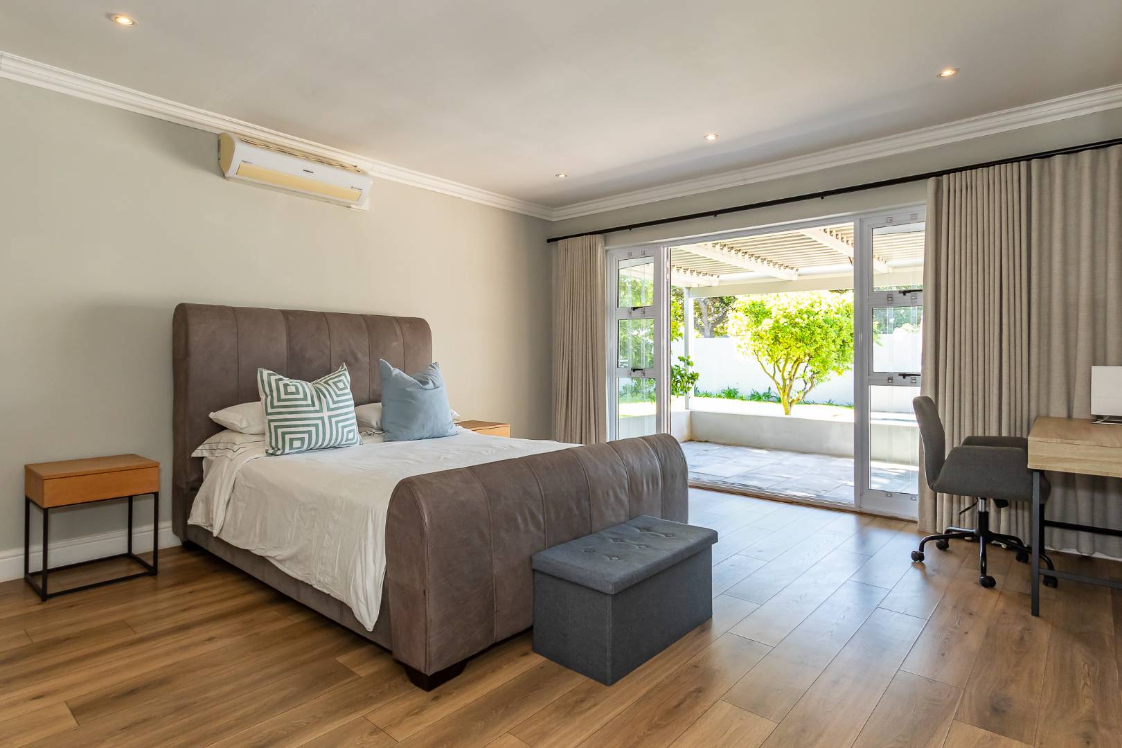 Sliding doors from the lounge and dining area open onto a generous covered patio that wraps around to the main bedroom, creating the perfect space for entertaining and relaxed outdoor living. The patio overlooks a beautiful garden with a sparkling pool and built-in braai area, ideal for hosting family and friends. From here, you can also enjoy magnificent sunsets disappearing behind the Constantia Berg mountains while sharing a glass of wine.