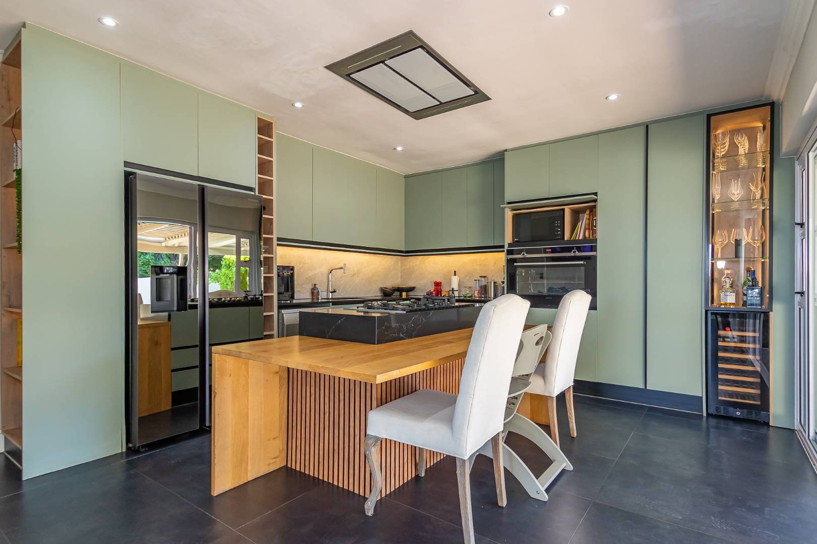 The immaculate kitchen combines functionality with modern style and features soft-touch cupboards, an electric oven with rotisserie, a wine fridge, black marble countertops, and a central island with gas hob and extractor fan — perfect for casual dining or social cooking.