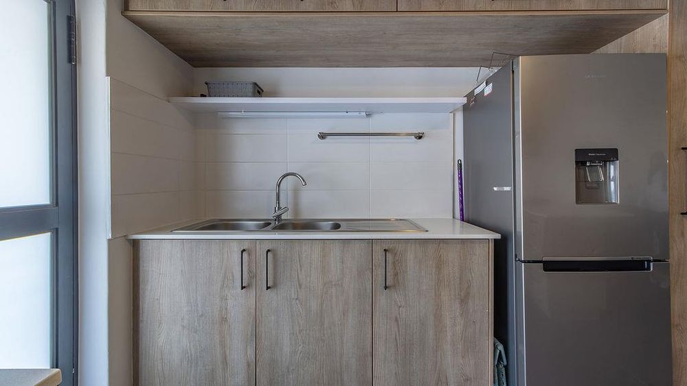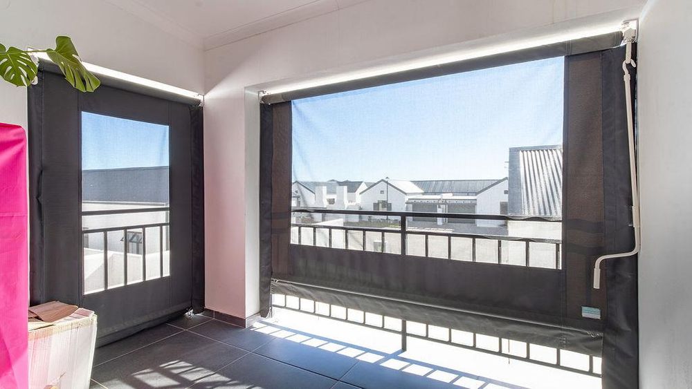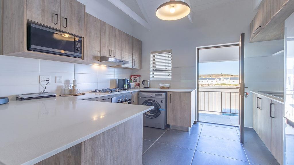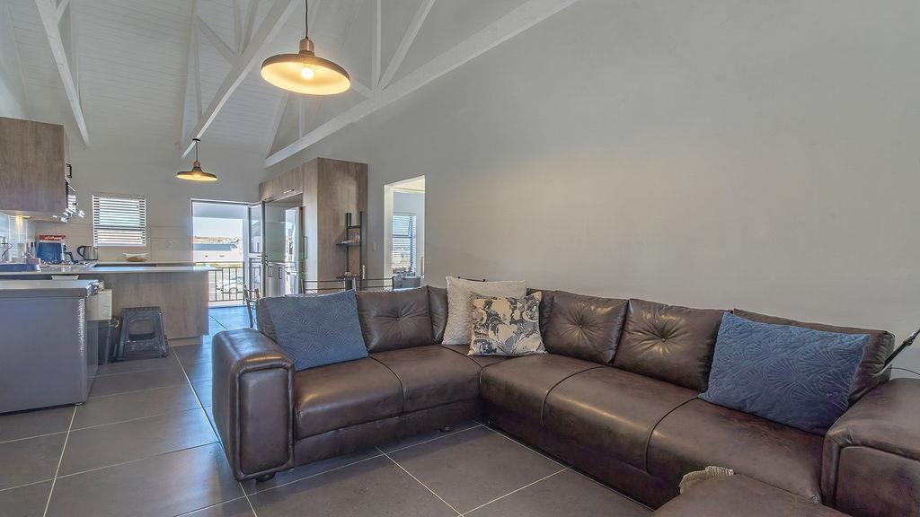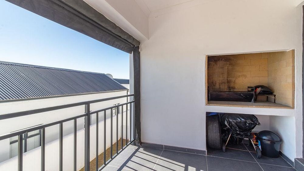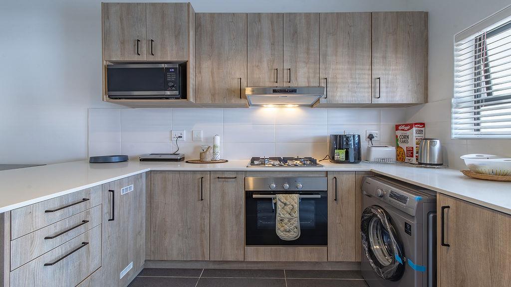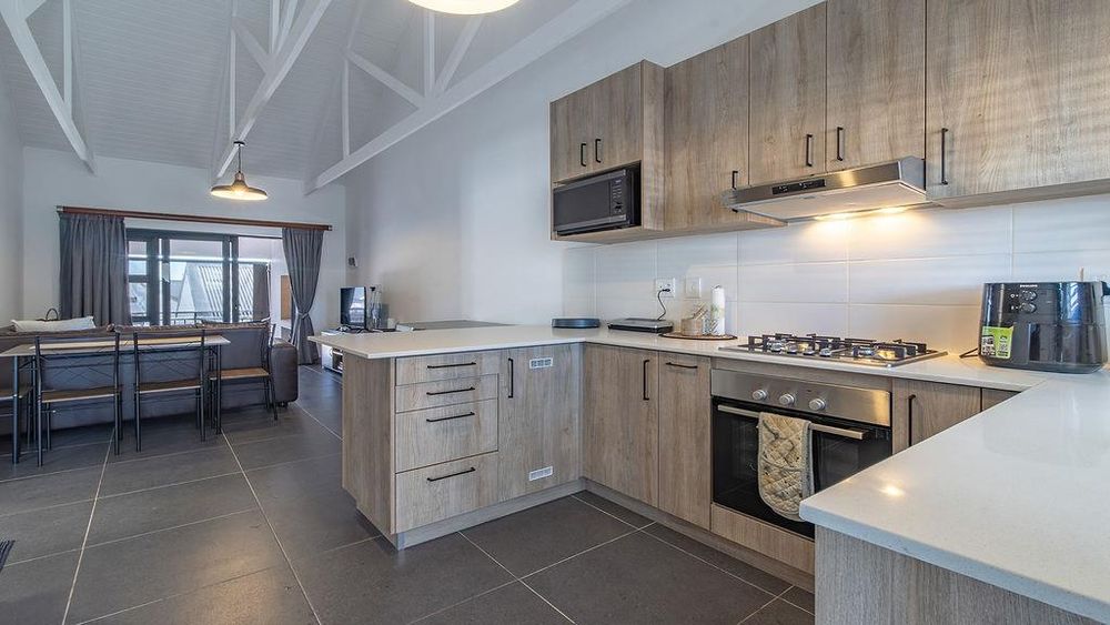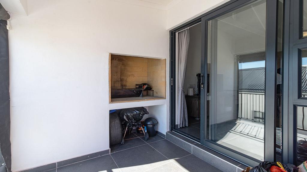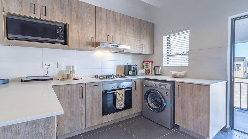 The open-plan kitchen is equipped with top-tier, modern finishes and includes appliance space, an oven with a gas hob, and an extractor fan. The open-plan dining/lounge area opens to a spacious undercover balcony that can be enclosed with a roll-up canvas covering and a built-in braai.