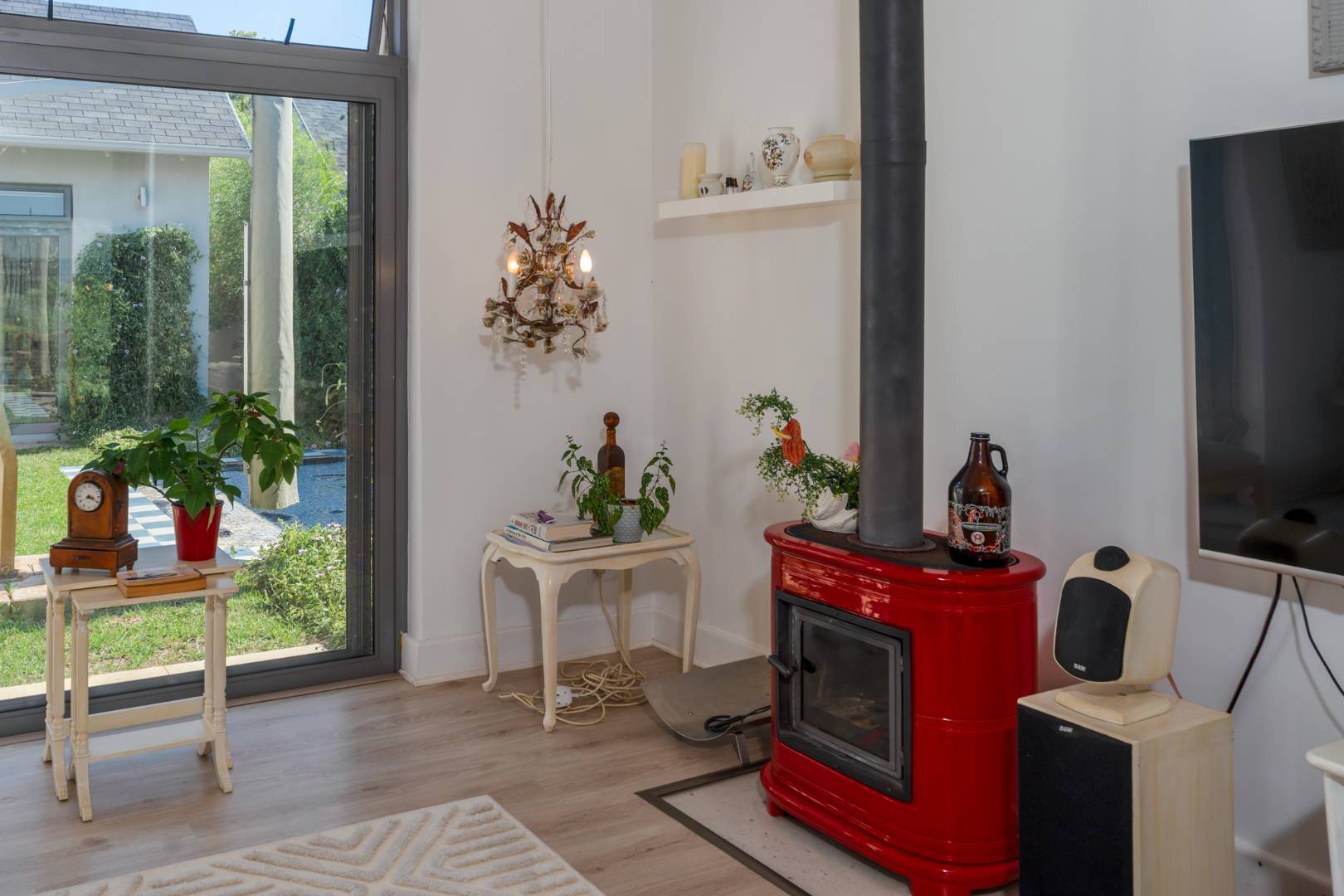Step into a sun‐drenched entrance and dining area that flows through expansive glass sliding doors to a private courtyard with sparkling pool and landscaped garden. The lounge and kitchen form the heart of the home, with sliding doors opening to both the courtyard and a large entertainment deck overlooking the estate’s pond. A striking apex wood‐panelled ceiling with clerestory windows floods the space with light, while a wood‐burning stove adds charm and warmth for cosy evenings.