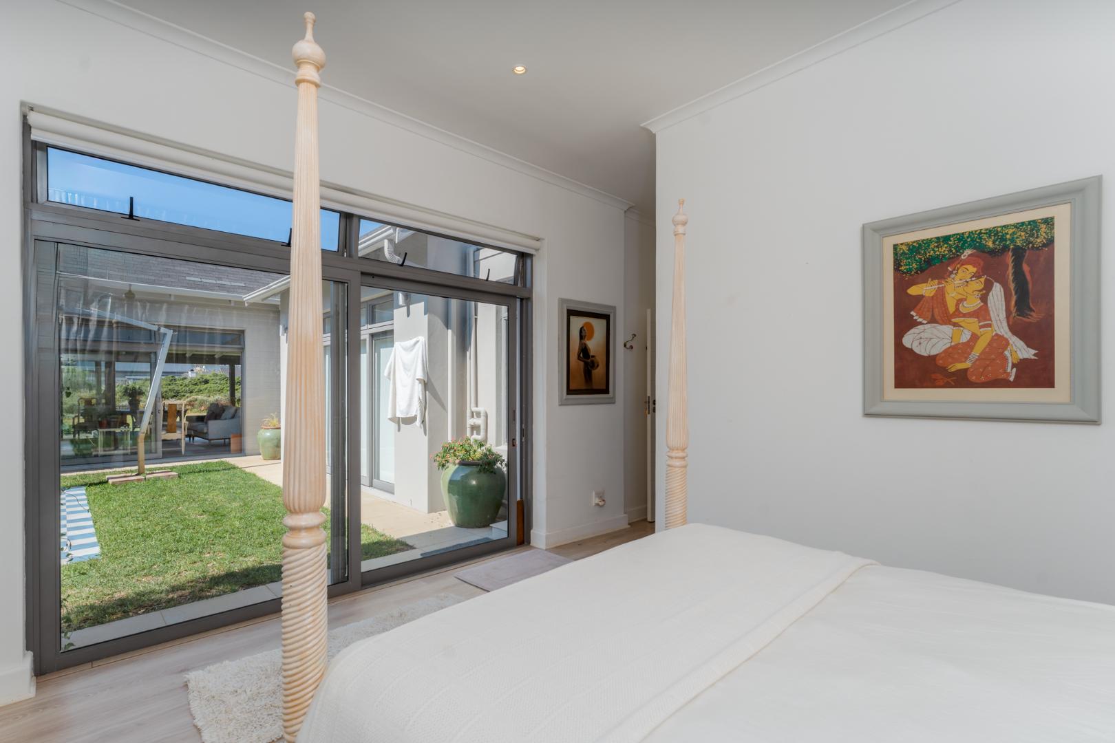 - The main suite enjoys serene views of the pool and garden courtyard, with sliding doors that invite the outdoors in. A modern en‐suite with shower completes this private retreat.