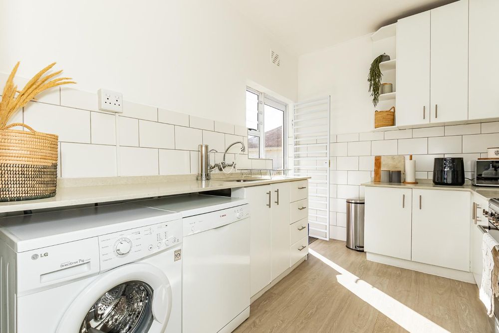 The modern kitchen is designed for convenience and style, fitted with a gas hob, electric oven, and plumbing for two appliances.