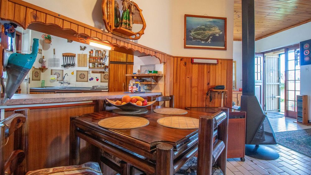 The main house features three double bedrooms, a full family bathroom, a guest cloakroom, a large country-style kitchen with a gas/electric stove and an open-plan lounge and dining area with a cosy fireplace. A bright sunroom adds extra living space and invites natural light throughout the day.