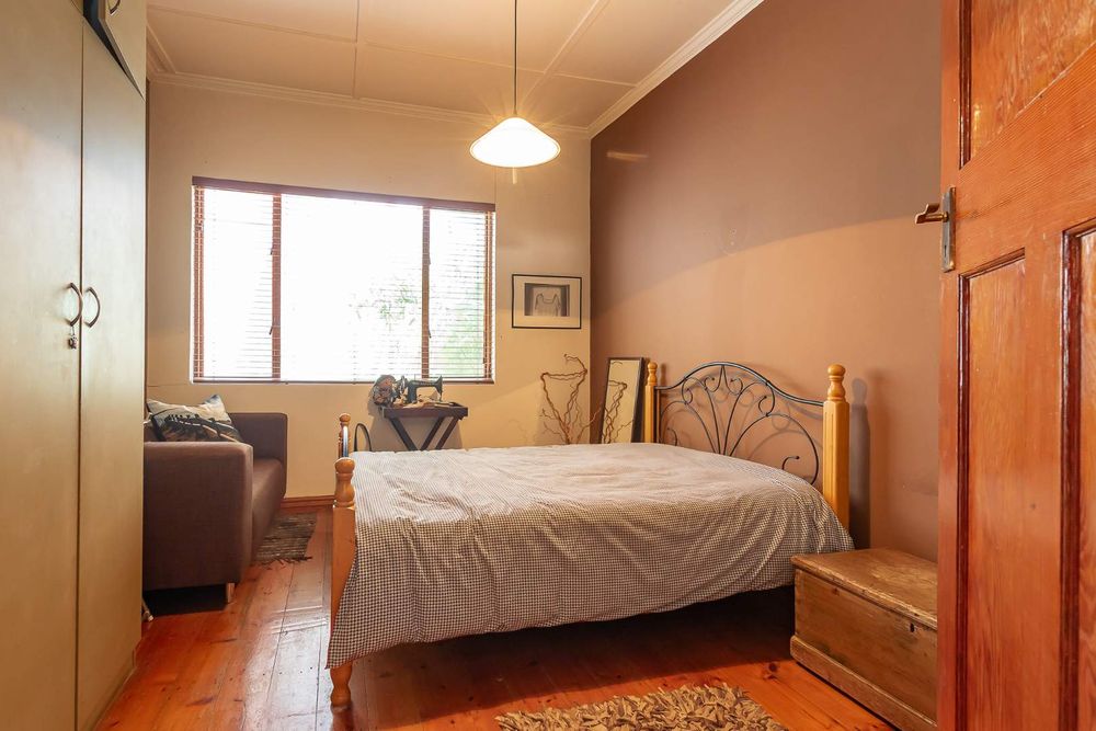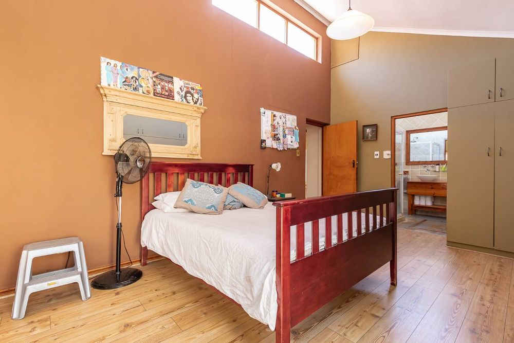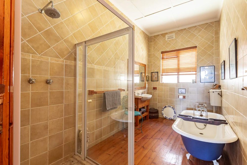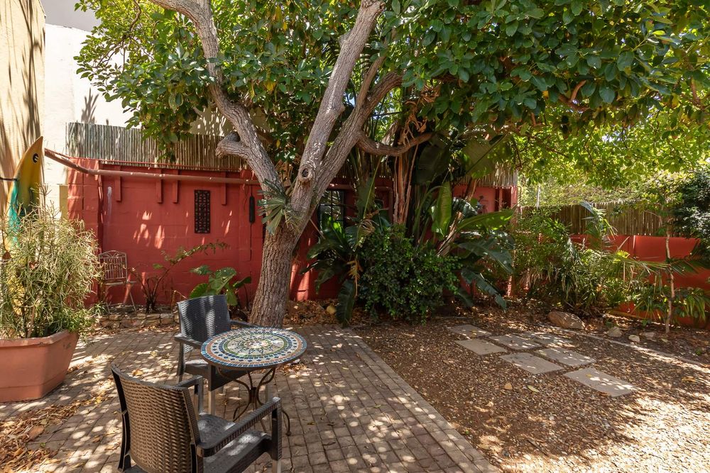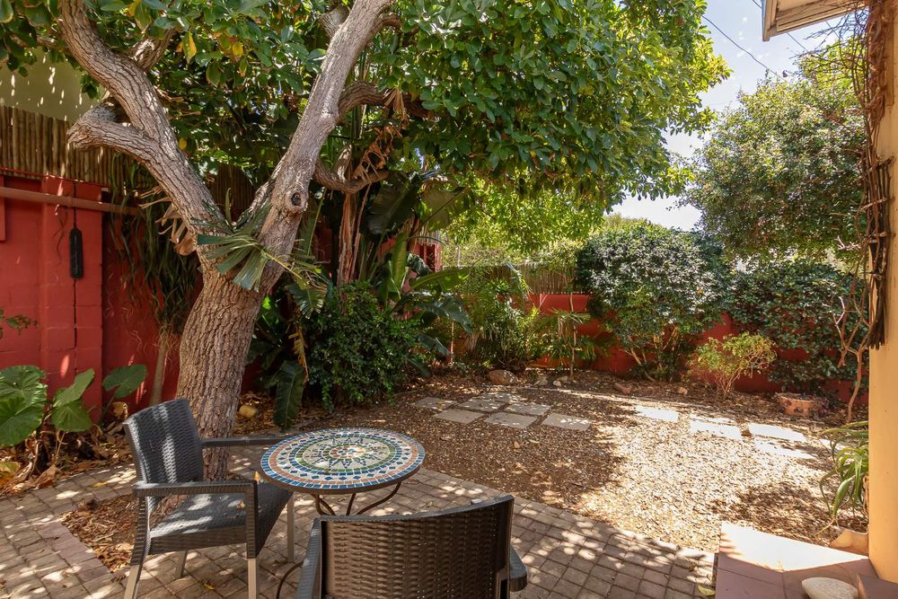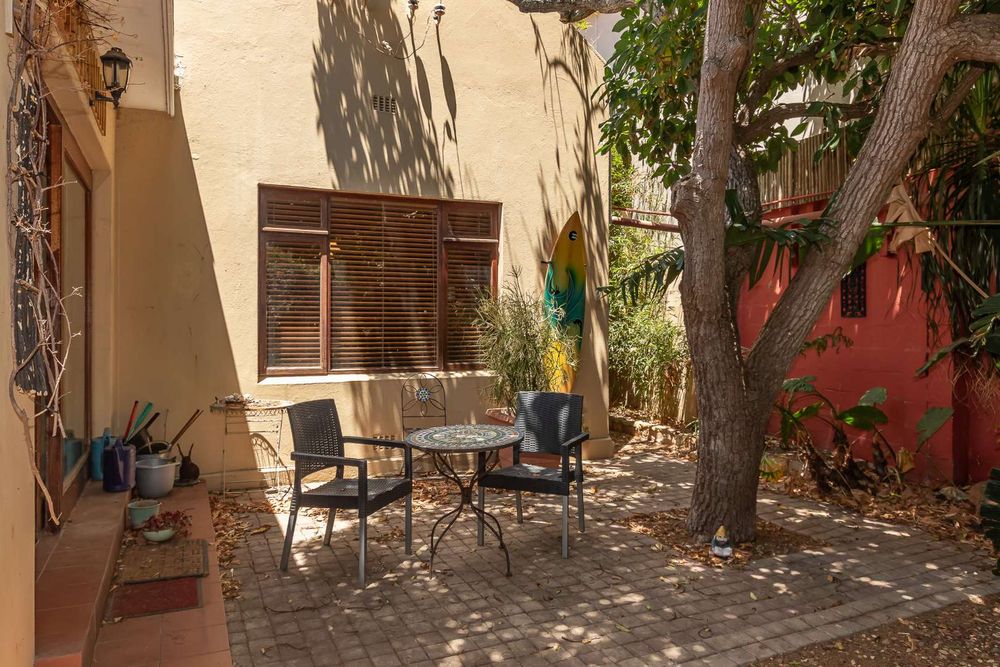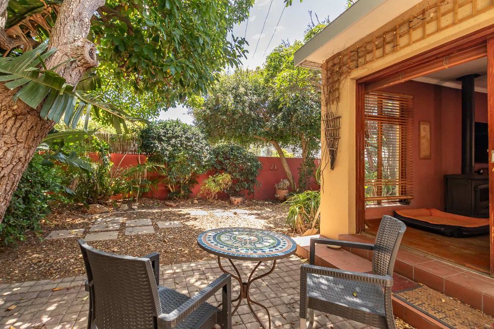 The home offers four well-sized bedrooms. The main bedroom features an en-suite with corner bath and separate shower, built-in cupboards, and doors opening to a private courtyard. The second bedroom includes built-in cupboards, a fireplace, and garden views, while the third bedroom also offers built-in cupboards. The fourth bedroom doubles perfectly as a home office.