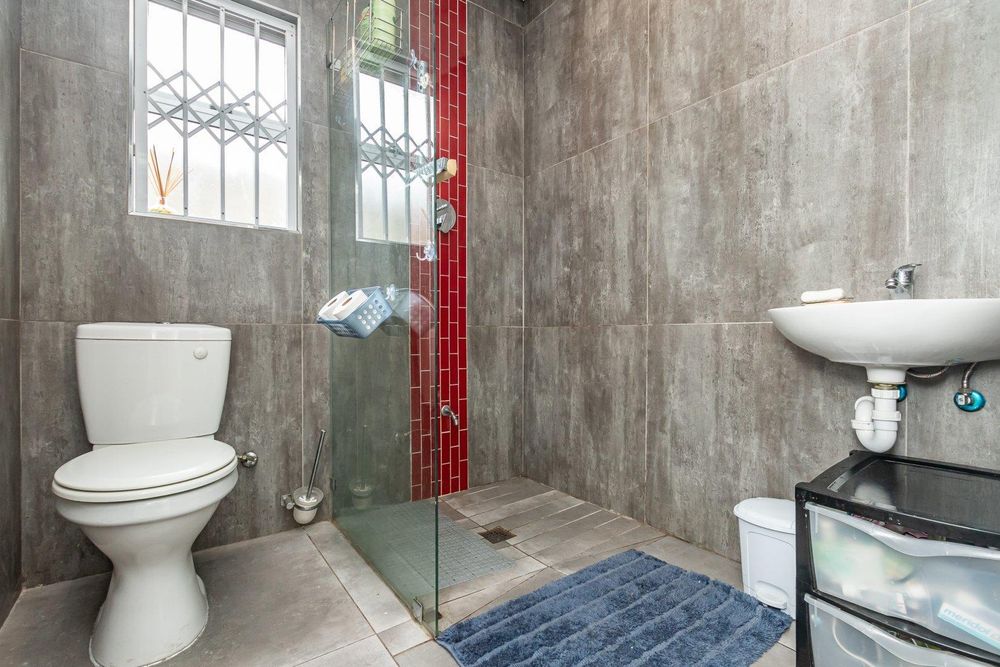 The stylish family bathroom features a modern shower, basin, and toilet.