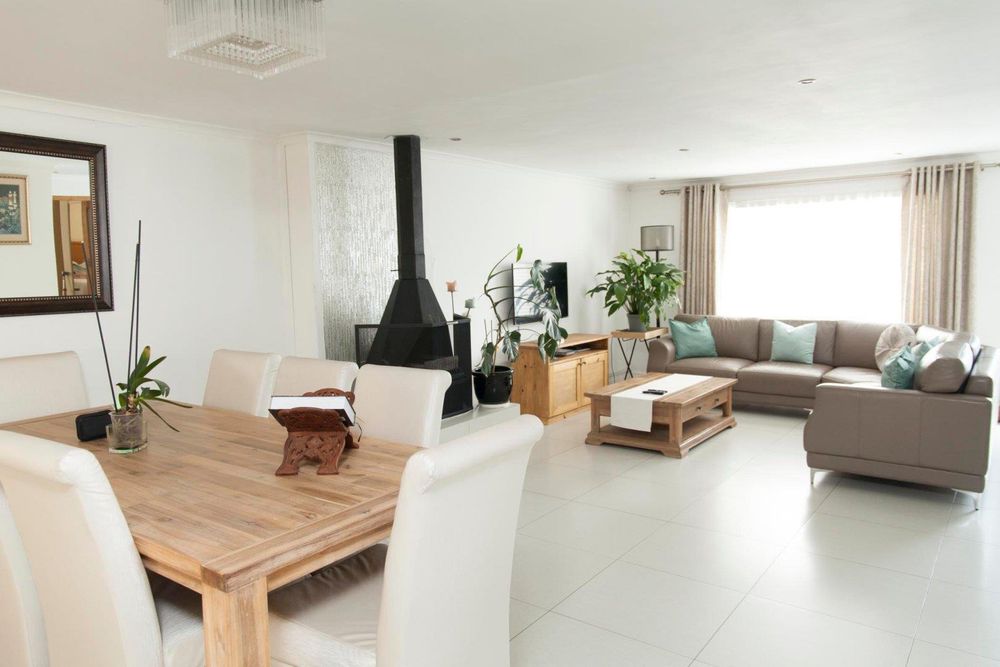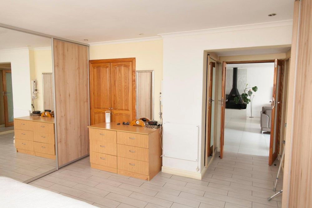 The open-plan lounge and kitchen are beautifully completed with top-notch finishes. There is a functional fireplace in the fully tiled lounge; the kitchen has volumes of cupboards, fitted stove, hob and extractor, with solid stone countertops.