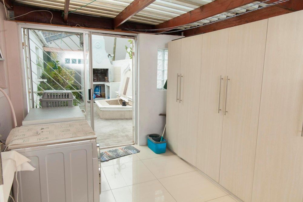 The backyard space is partially covered, with plug points for both a washing machine and a dishwasher. There is also a built-in braai facility, accompanied by a water fountain.
