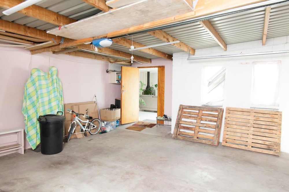 The automated double garage is larger than usual, with the rear end housing a water tank and a small storage area.