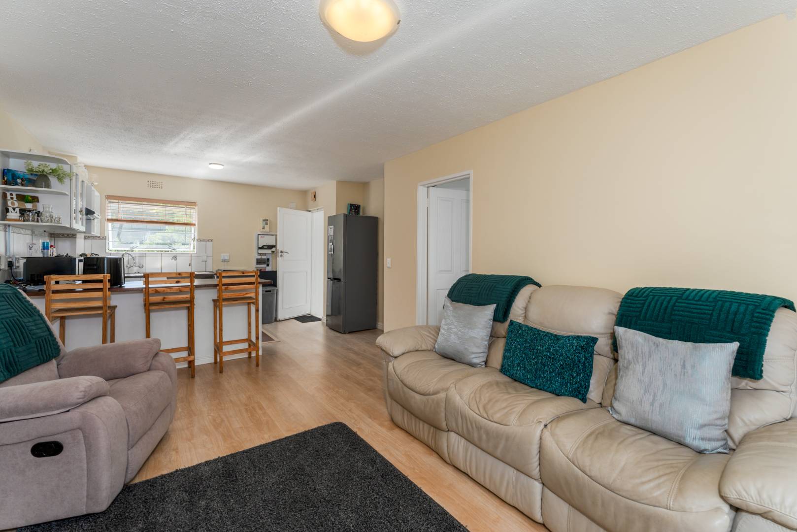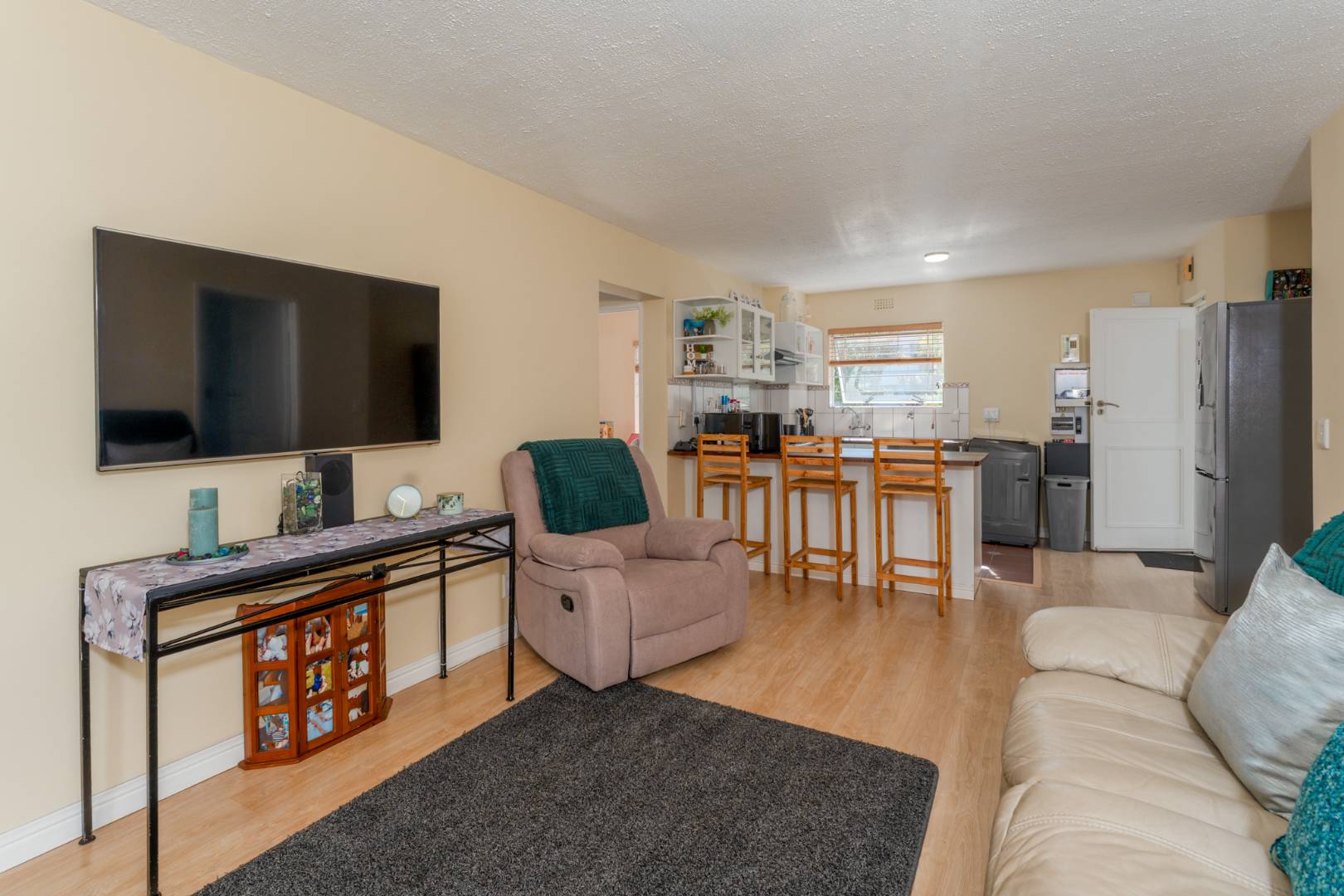 This light-filled, immaculate three-bedroom apartment is move-in ready and designed for easy living. Sliding doors open onto your own private braai patio and garden area—ideal for entertaining or simply unwinding outdoors. Laminated flooring throughout enhances the clean, contemporary feel.