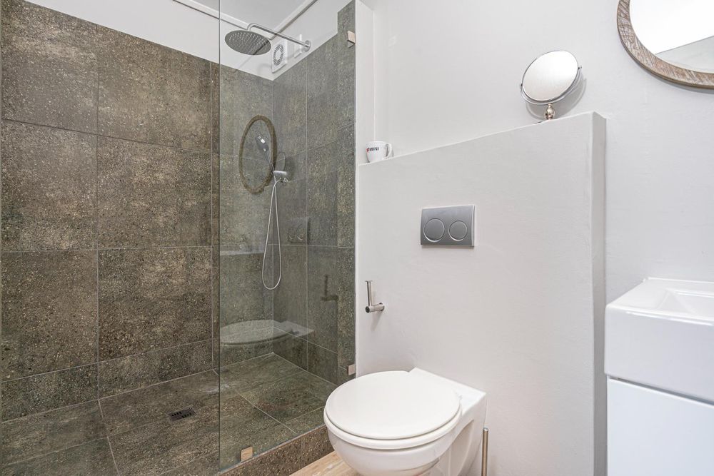 The property boasts two spacious bedrooms with built-in cupboards, ensuring ample storage. The main bedroom features an en-suite bathroom for added privacy and comfort, while a main bathroom with a shower, basin, and toilet serves the rest of the apartment.