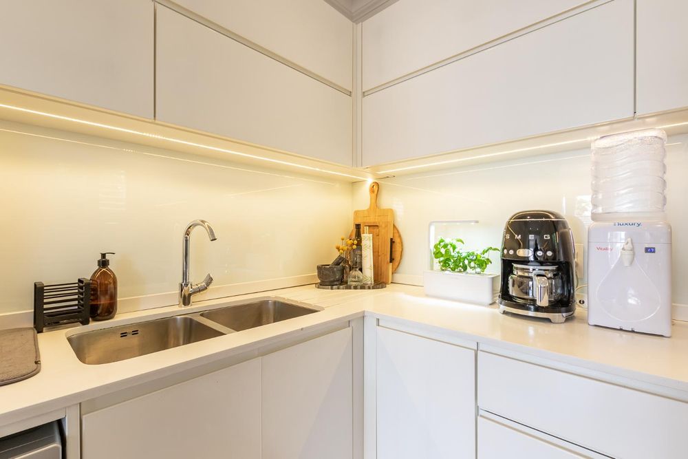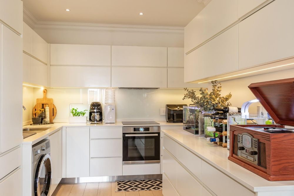The kitchen is a chef's dream, equipped with Caesarstone countertops, bespoke cabinetry, and high-end appliances including a double sink with a stylish Hansgrohe mixer.
